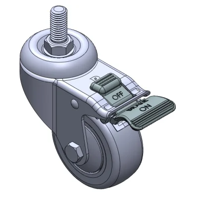 配有雙煞式,鎖定系統的腳輪。牙心鉚合沖壓腳架—1/2"-12牙 表面振動,絲扣式安裝裝置(鋅鋁合金踏板) 耐衝擊聚丙烯輪芯,熱塑性彈性体(TPR)輪面 灰色,輪子軸承—精密滾珠。
