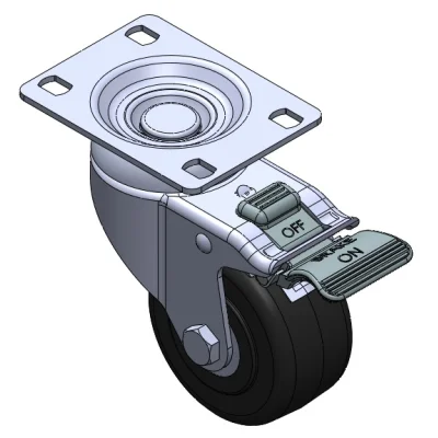 配有雙煞式,鎖定系統的腳輪。牙心鉚合沖壓腳架—1/2"-12 牙 表面振動,絲扣式安裝裝置(鋅鋁合金踏板) 浸軟織物的壓縮合成樹脂輪芯、輪面 黑色,輪子軸承—精密長珠。