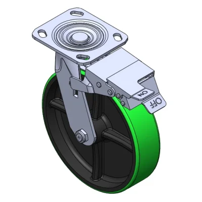 配有侧煞式,锁定系统的脚轮。焊接钢板架 表面镀锌,底板式安装装置 铸铁制轮芯,高品质聚氨酯轮面 绿色,轮子轴承—精密长珠。