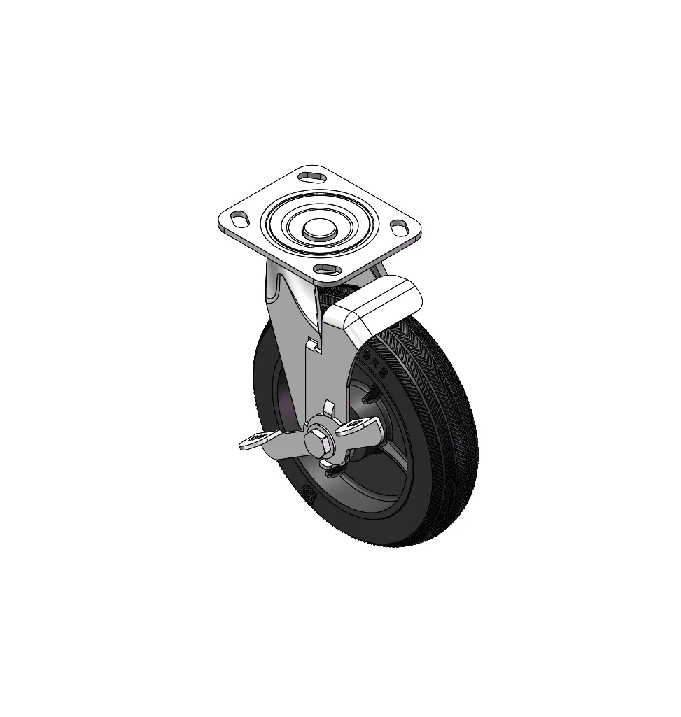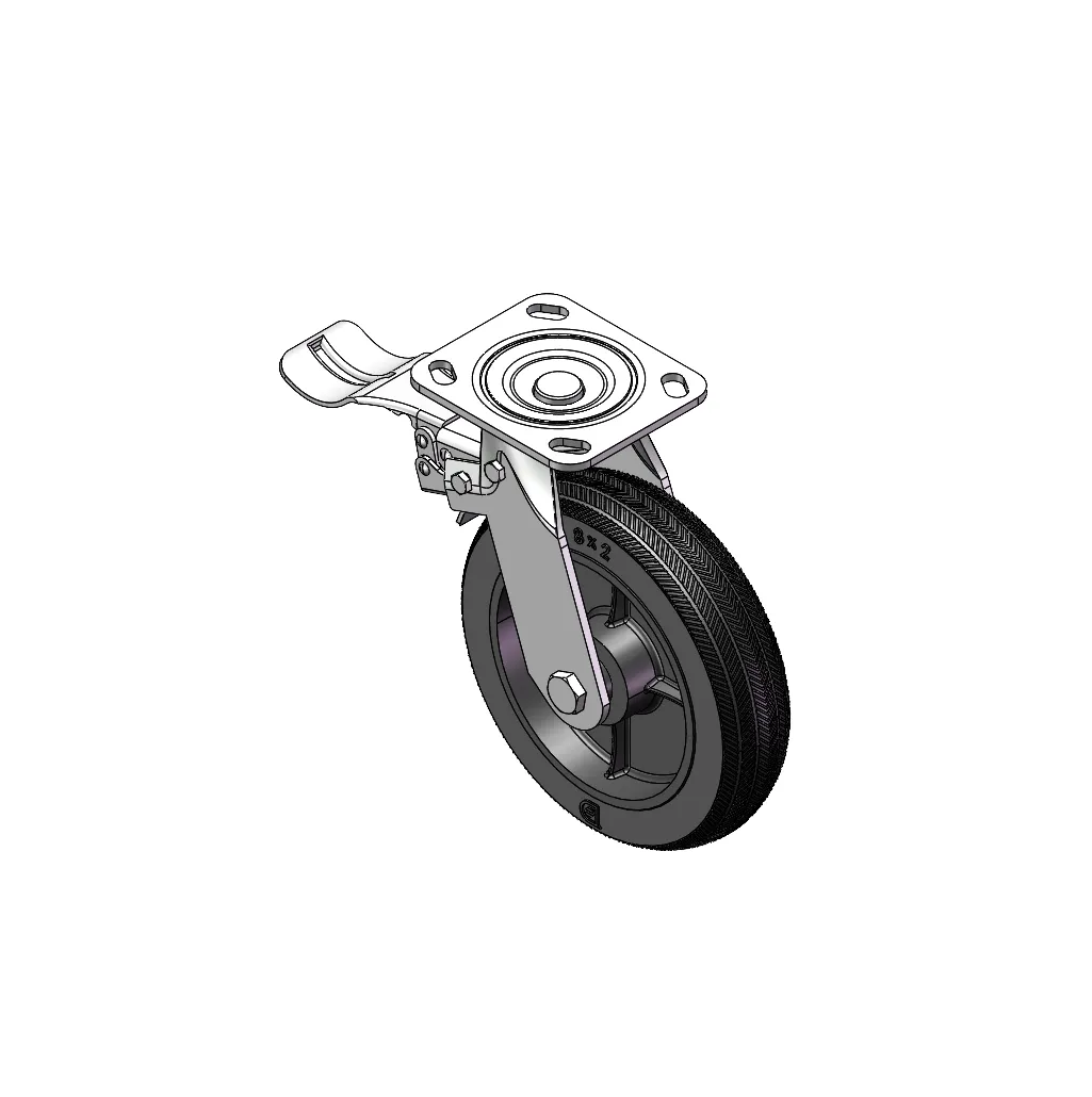 Side brake Caster with Locking system. Top Plate Riveted and Stamping - D-shaped. Hole Zine-Plated, Top Plate (4.5T) Mounting Type system Cast Iron Wheel Center with High-Quality Resilient Rubber tread Iron black, Bearing - Ball Bearing.