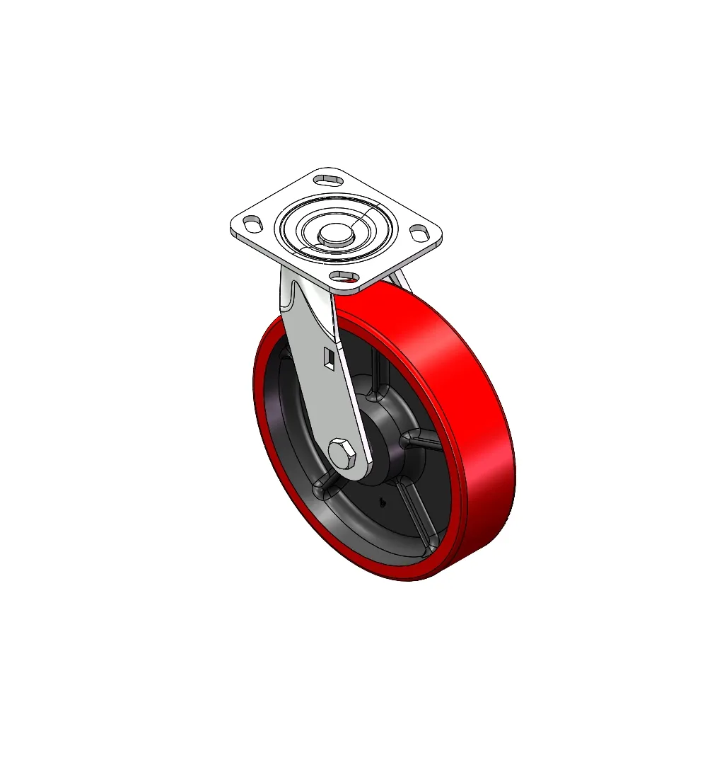 Swivel Caster with Riveted Fork and Stamping Fork - 85 x 70mm (3-3/8" x 2-3/4") Bolt Hole Spacing Zine-Plated, Fork-mounted (4.5T) Mounting Type system Cast Iron Wheel Center with High Quality Polyurethane tread Red Cast Iron finish, Bearing - Ball Bearing.