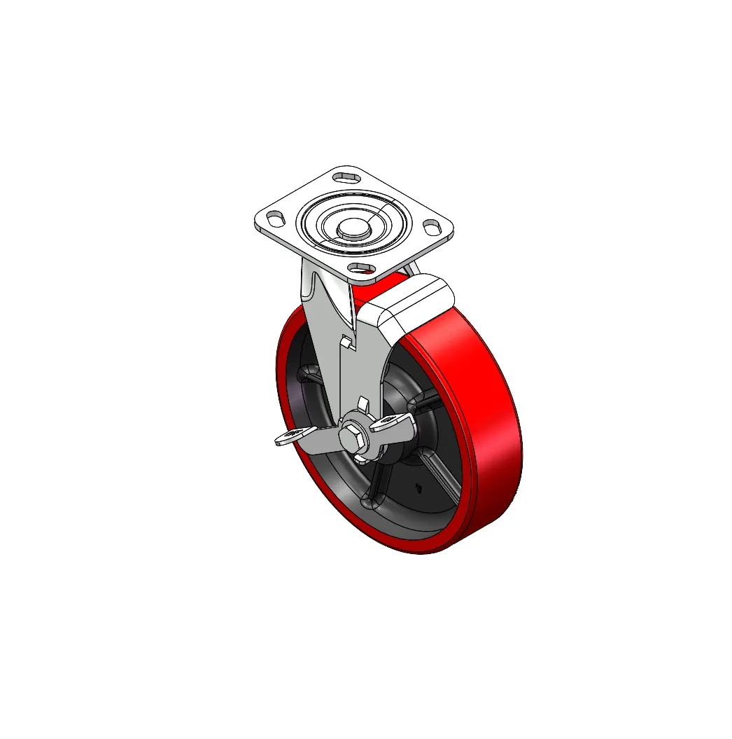 Side brake Caster with Locking system. Top Plate with Riveted Stamping Fork and 85 x 70mm (3-3/8" x 2-3/4") Bolt Hole Spacing. Zine-Plated, Top Plate (4.5T) Mounting Type system. Cast Iron Wheel Center with High Quality Polyurethane tread. Red Cast Iron finish, Bearing with Ball Bearing.
