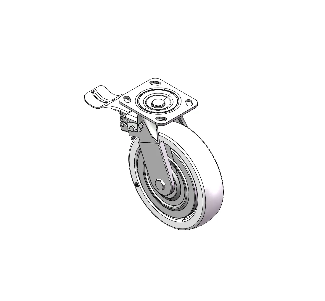 Side (wheel) brake Caster with Locking system. Top Plate Riveted and Stamping - D-shaped. Hole Zine-Plated, Top Plate (4.5T) Mounting Type system Reinforced Polypropylene and tread Transparent, Bearing - Ball Bearing.