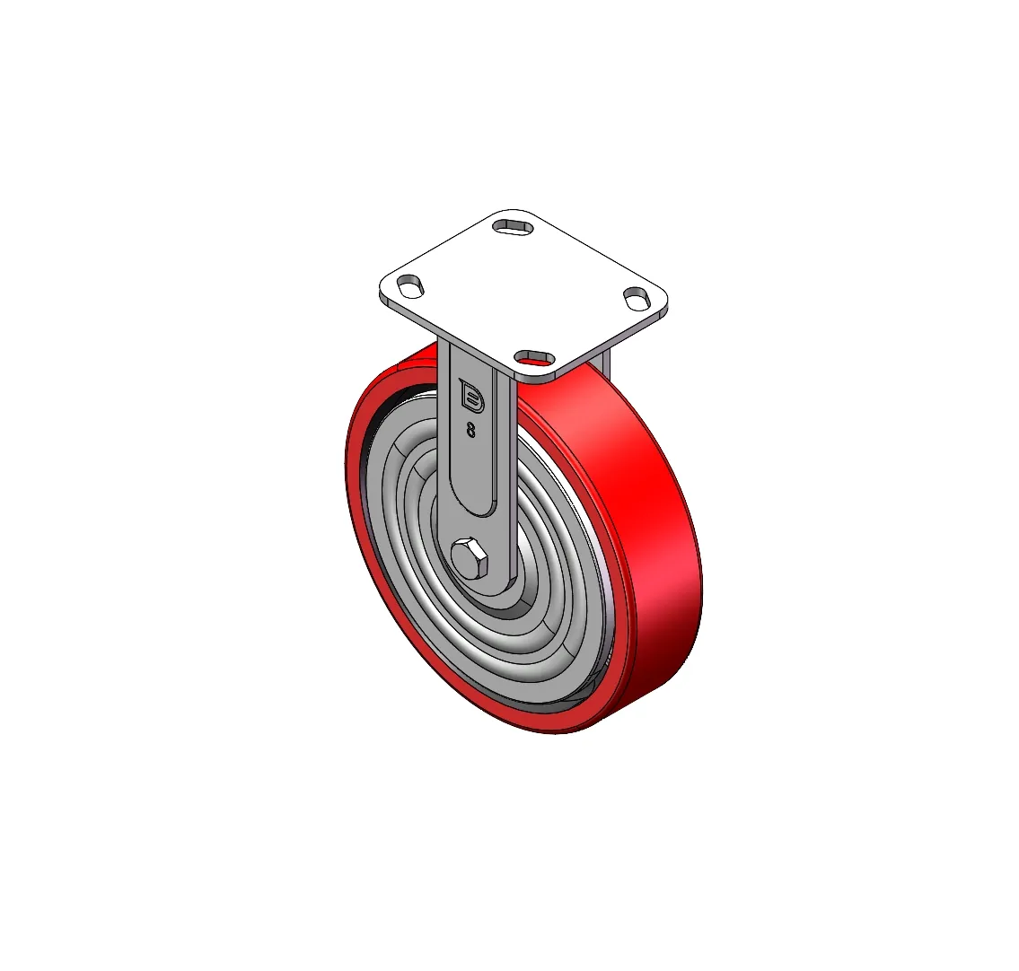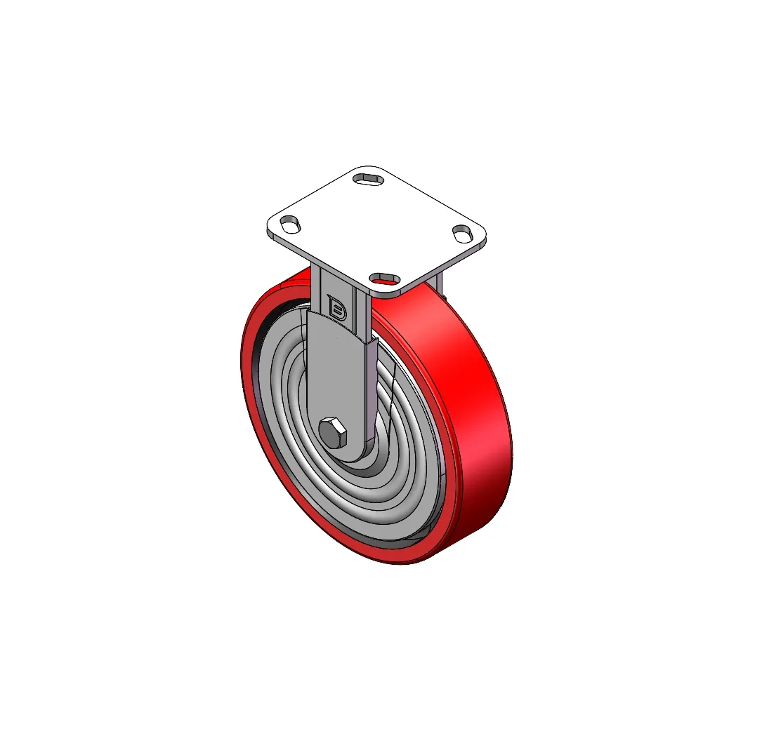 Rigid Caster, Welded-on Fork with 85 x 70mm (3-3/8" x 2-3/4") Bolt Hole Spacing Mounting Type Zine-Plated, Top Plate (4.5T) Mounting Type system Cast Iron Wheel Center with High Quality Polyurethane tread Red Cast Iron finish, Ball Bearing, and a special anti-wrap wheel cover