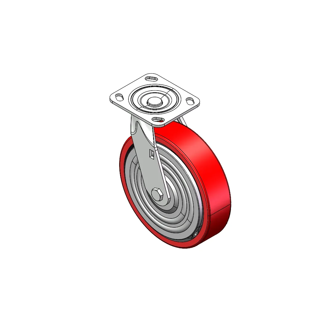 Swivel Caster with Riveted Fork and Stamping Fork—D-shaped hole. Zine-Plated, Fork-mounted (4.5T) Mounting Type system. Cast Iron Wheel Center with High Quality Polyurethane tread. Red Cast Iron finish, Ball Bearing, and a special anti-wrap wheel cover.
