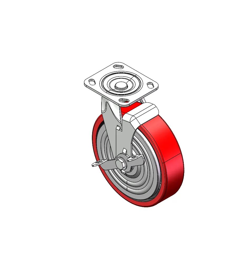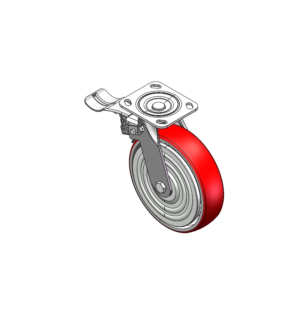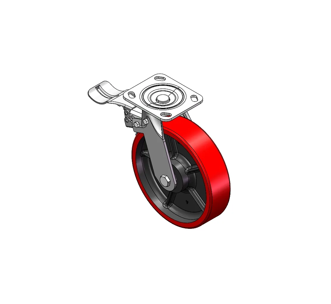 Side brake Caster with Locking system. Top Plate with Riveted Stamping Fork and 85 x 70mm (3-3/8" x 2-3/4") Bolt Hole Spacing. Zine-Plated, Top Plate (4.5T) Mounting Type system. Cast Iron Wheel Center with High Quality Polyurethane tread. Red Cast Iron finish, Bearing with Ball Bearing.