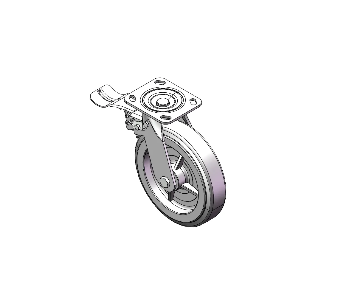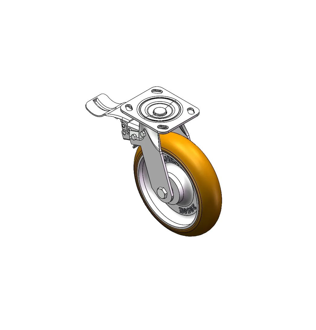 Center Brake Locking system. Top Plate with Riveted, Stamping Fork and 85 x 70mm (3-3/8" x 2-3/4") Bolt Hole Spacing. Zine-Plated, Top Plate (4.5T) Mounting Type system. Cast Iron Wheel Center with High Quality Polyurethane tread. Iron brown, Bearing with Ball Bearing.