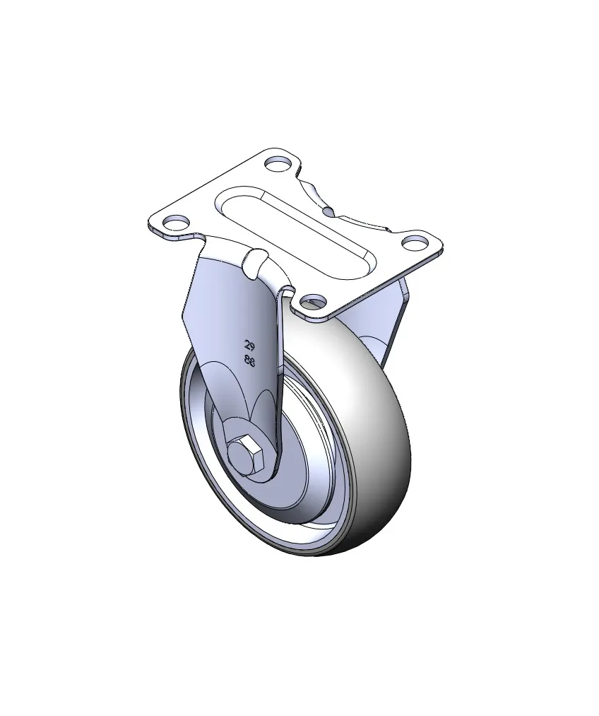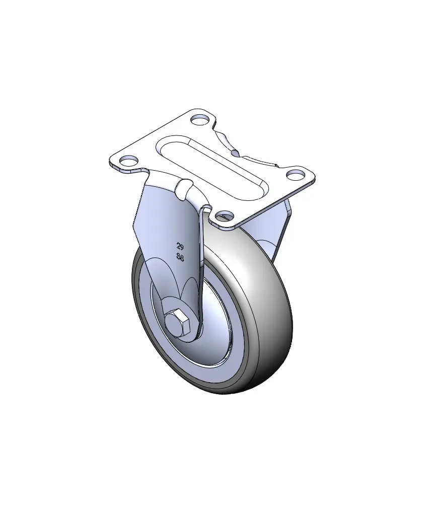 Rigid Caster with integrally molded, Stamping footrest and 72 x 53.5 mm (2-7/8" x 2-1/8") Bolt Hole Spacing. Zine-Plated, Mounting Type - Top Plate with plastic cover. Aluminum core with High Quality Polyurethane Wheel Tread. Gray color. Bearings: Ball Bearings.