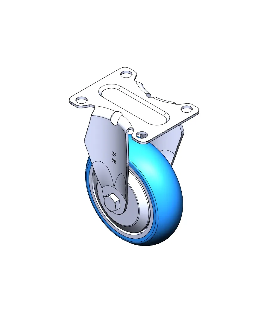 Rigid Caster with integrally molded Stamping footrest and 72 x 53.5 mm (2-7/8" x 2-1/8") Bolt Hole Spacing. Zine-Plated, Mounting Type - Top Plate, and plastic cover. Aluminum core with High Quality Polyurethane Wheel Tread. Blue color. Bearings: Ball Bearings.