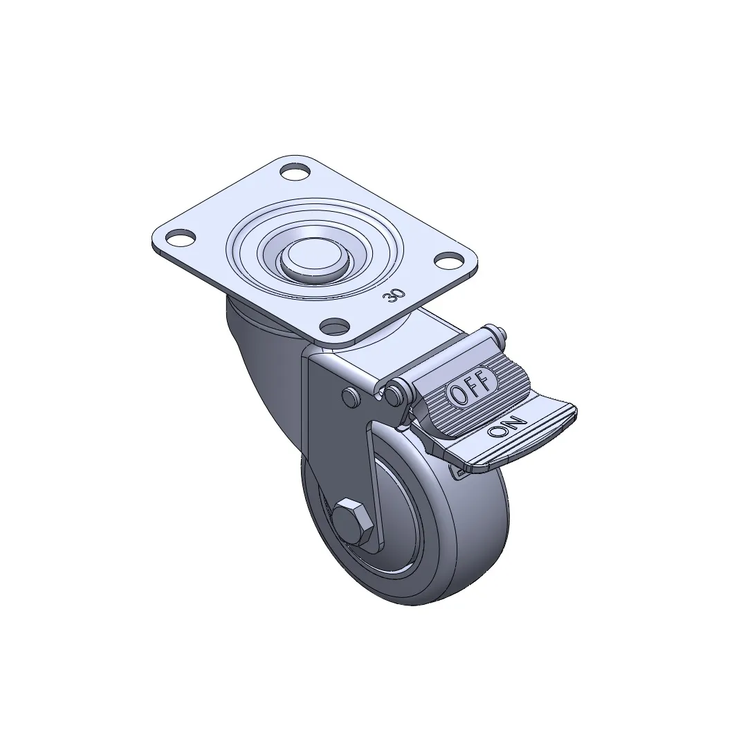 Casters with Total Brakes and a With locking system. Base plate Riveted and Stamping - instrument Fork. Hole Zine-Plated, Mounting Type - Top Plate. High-Quality Impact-Resistant Polypropylene Wheel Center, High-Quality Reinforced Polypropylene Rubber (TPR) Wheel Tread. Dark gray, Bearing - Ball Bearings.