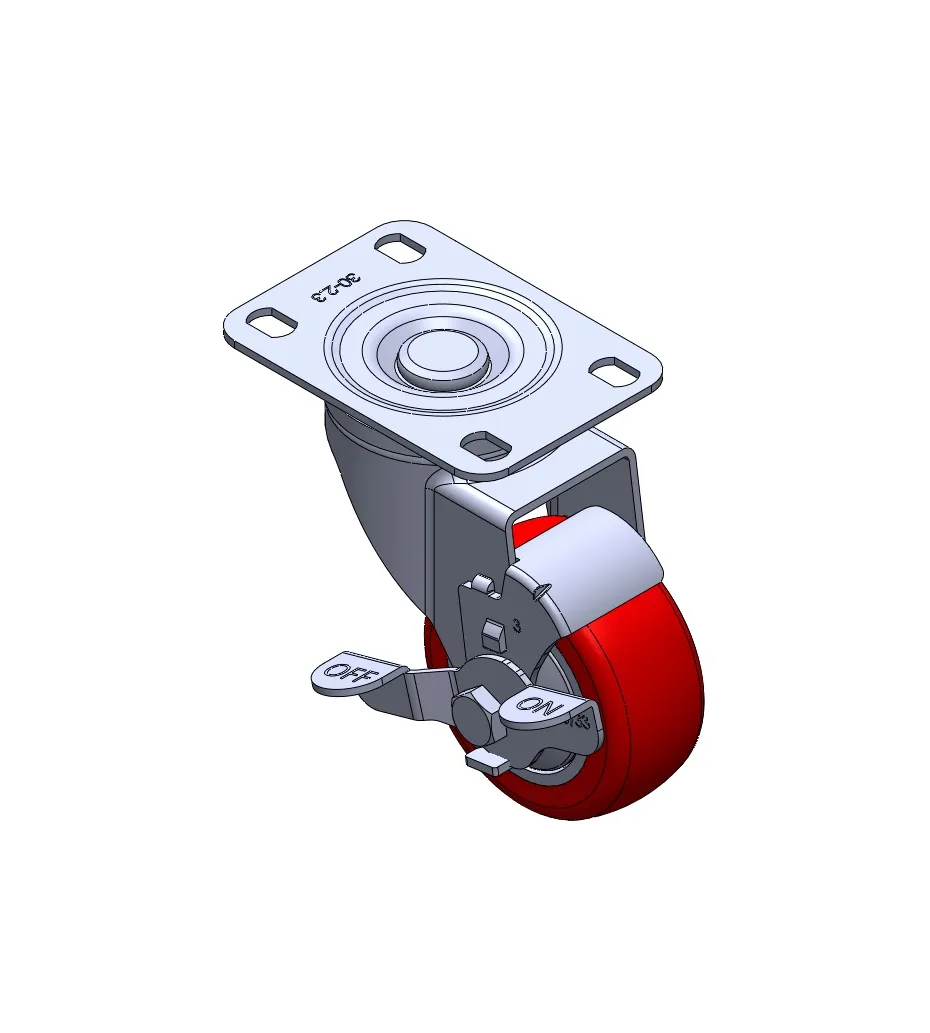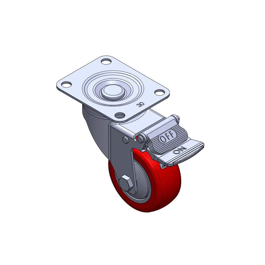 Casters with a Total Brake and With locking system. Premium Fork with Riveted Fork. Zine-Plated, Top Plate (3T) Mounting Type mechanism. High-Quality Impact-Resistant Polypropylene Wheel Center with High-Quality Reinforced Polypropylene Rubber (TPR) Wheel Tread. Red color. Bearings: Ball Bearings.