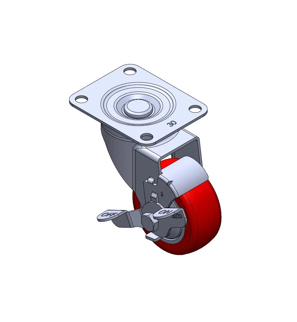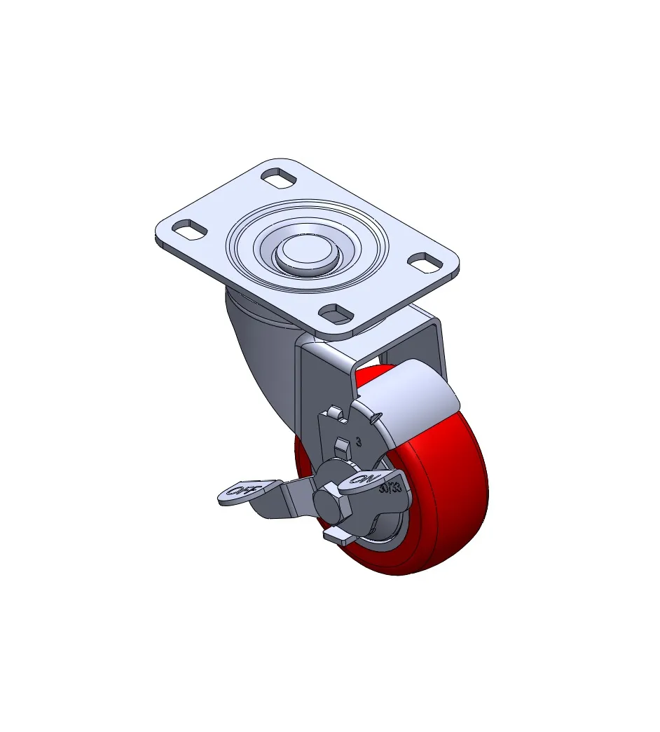 Casters with Total Brakes and a With locking system. Top Plate Riveted and Stamping - instrument Fork. Hole Zine-Plated, Mounting Type - Top Plate. High-Quality Impact-Resistant Polypropylene Wheel Center, High-Quality Reinforced Polypropylene Rubber (TPR) Wheel Tread. Red color, Bearing - Ball Bearings.
