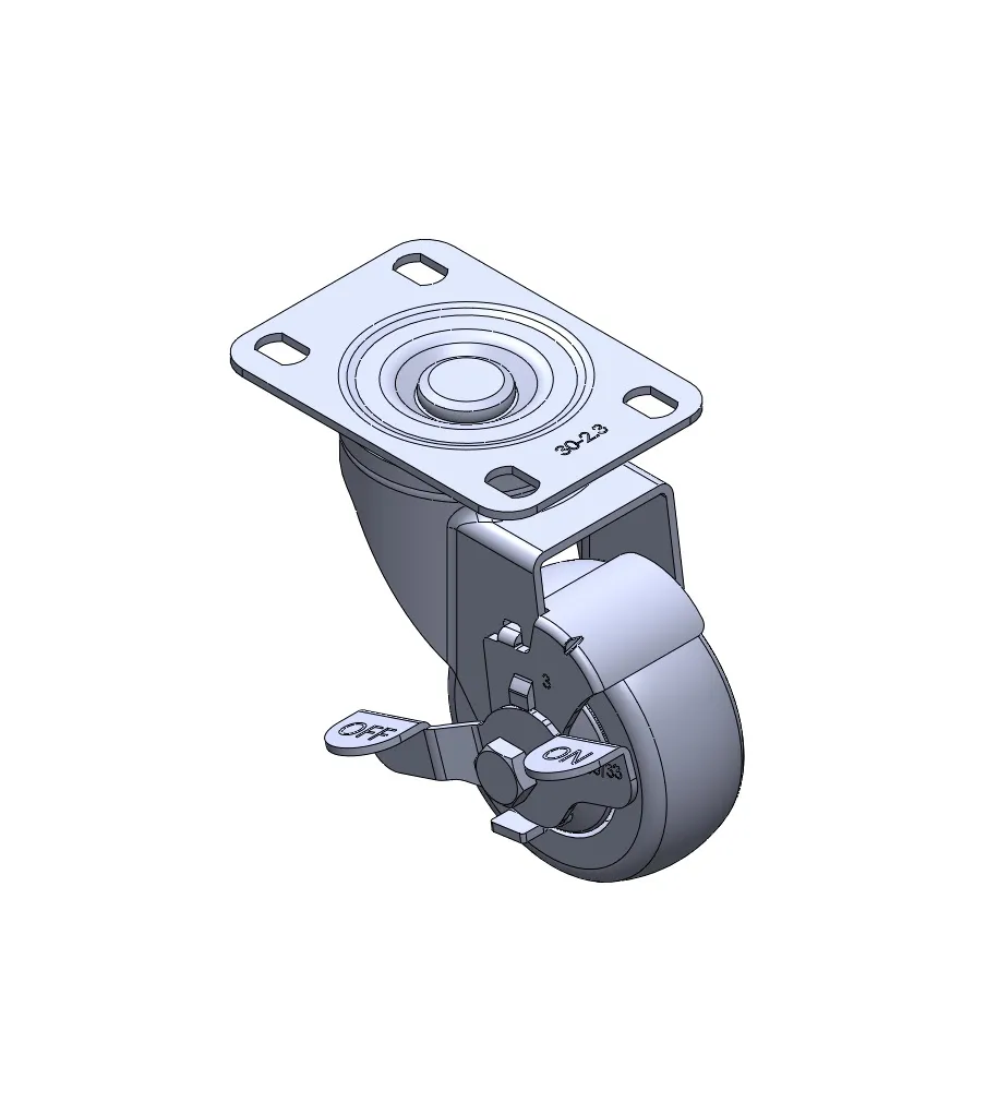 Casters with Side Brakes and With locking system. Base plate Riveted and Stamping with 72 x 53.5 mm (2-7/8" x 2-1/8") Bolt Hole Spacing. Zine-Plated, Mounting Type - Top Plate. High-Quality Impact-Resistant Polypropylene Wheel Center with High-Quality Reinforced Polypropylene Rubber (TPR) Wheel Tread. Dark gray, Bearing with Ball Bearings.