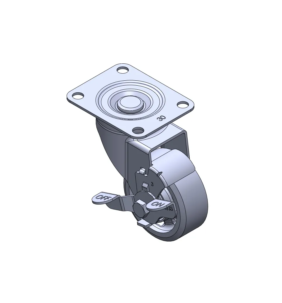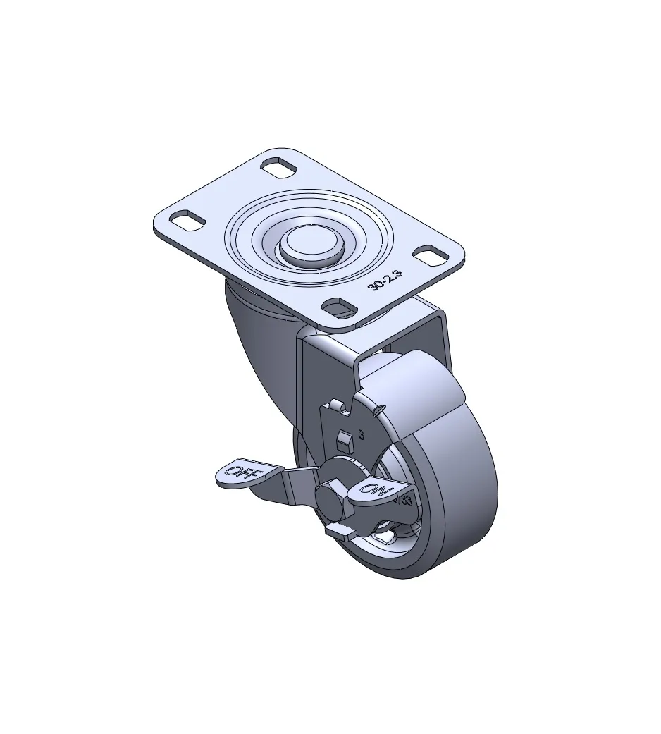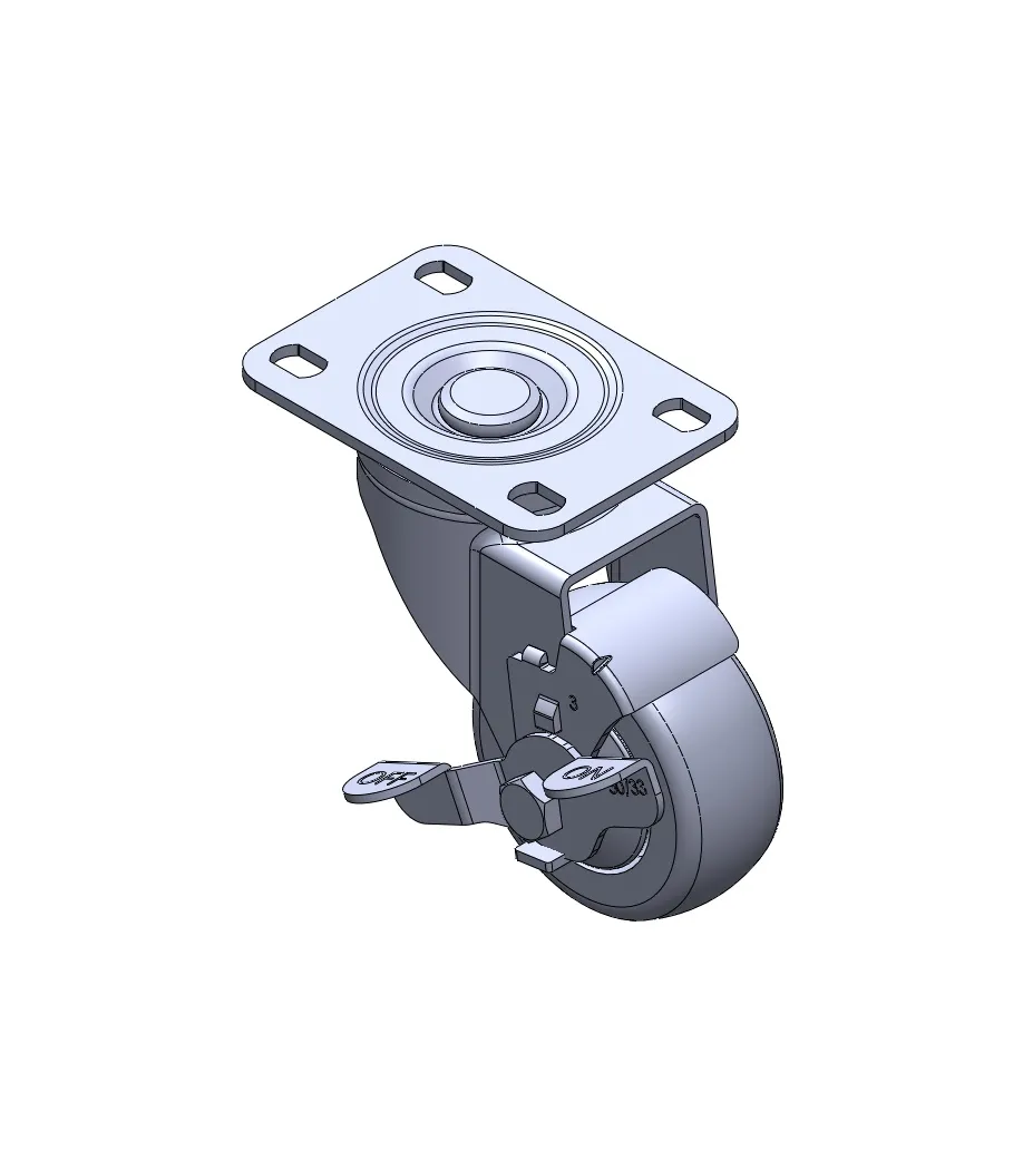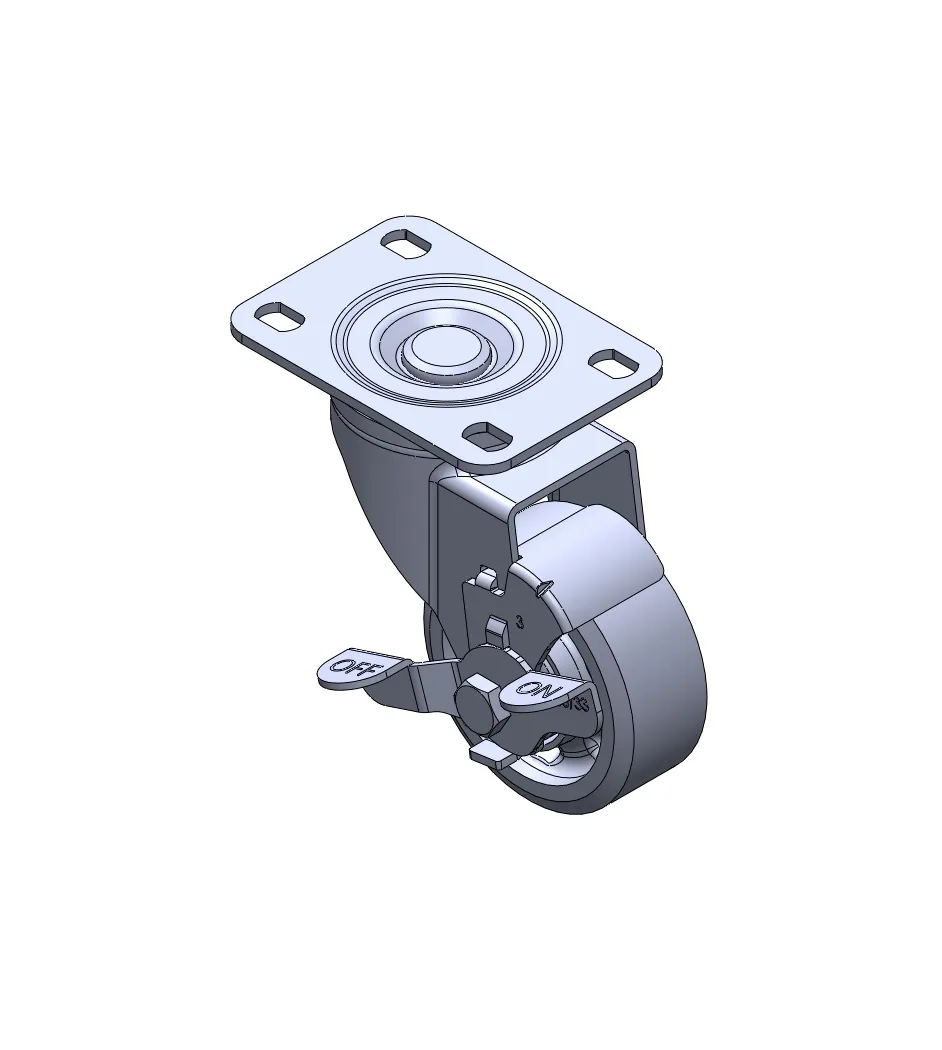 Casters with Side Brakes and With locking system. Premium Fork with Riveted Fork. Zine-Plated, Mounting Type - Top Plate. Reinforced, impact-resistant polypropylene Wheel Center with High-Quality Reinforced Polypropylene Rubber (TPR) Wheel Tread. Dark gray, Bearing with Ball Bearings.