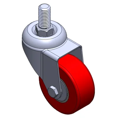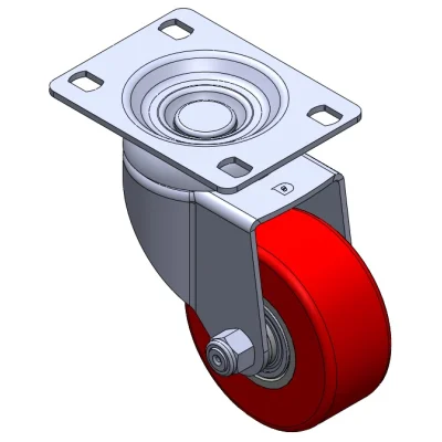 Swivel Casters, Riveted and Stamping Top Plate with high-grade perforations. Surface vibration protection, Mounting Type - Top Plate. Cast Iron Wheel Center, High Quality Polyurethane Wheel Tread. Red color, Bearing—Ball Bearings.