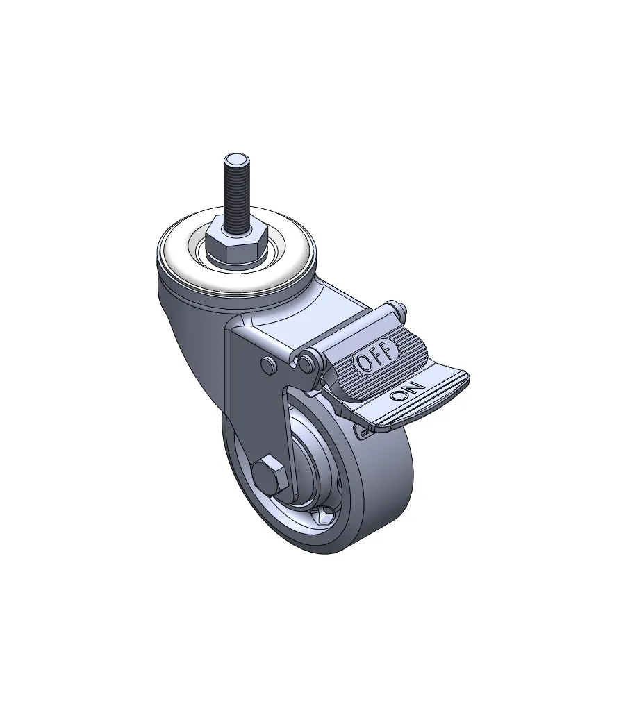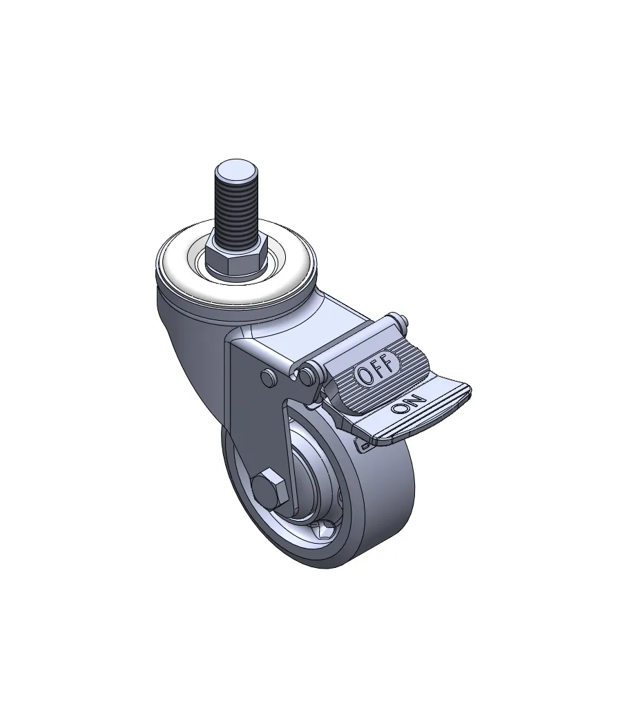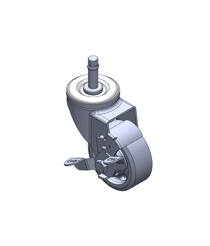 Casters with Side Brakes and With locking system. Stamping, Riveted Fork – Ø11x38L Electroplated finish, Mounting Type - Cylindrical Stem, brass buckle included Reinforced, impact-resistant polypropylene core with High-Quality Reinforced Polypropylene Rubber (TPR) Wheel Tread Dark gray, Ball Bearings.