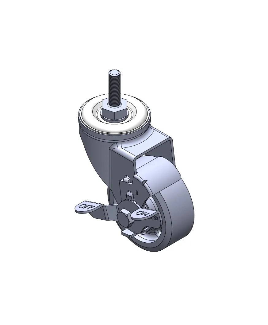 Casters with Total Brakes and With locking system. Riveted Stamping Fork with 3/8-16 threads Zine-Plated, Mounting Type - Threaded Stem Reinforced impact-resistant polypropylene Wheel Center with High-Quality Reinforced Polypropylene Rubber (TPR) Wheel Tread Dark gray, Bearing with Ball Bearings
