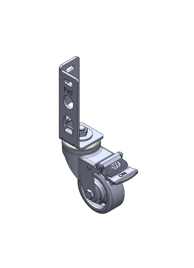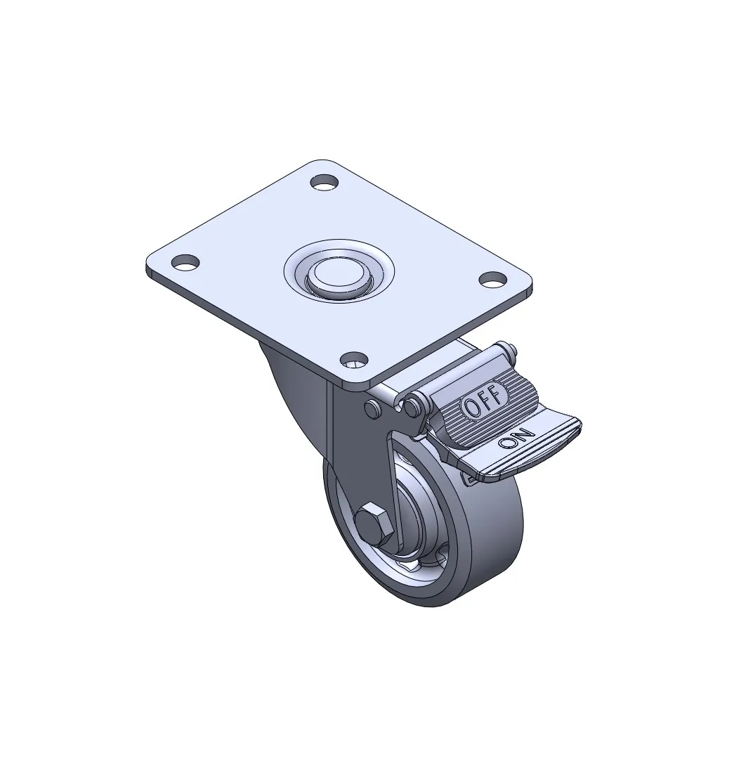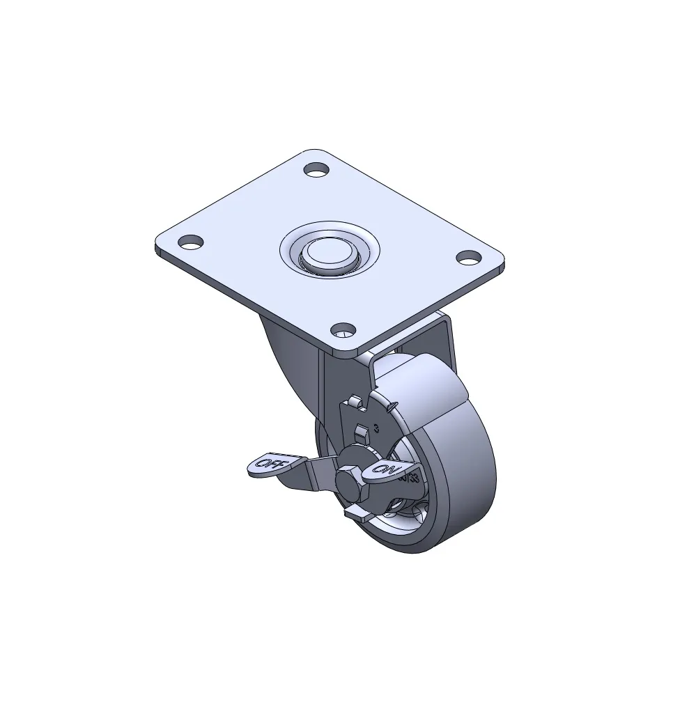 Casters with Side Brakes and With locking system. Top Plate with Riveted, Stamping, round hole. Electroplated finish, Top Plate (4T) Mounting Type system. Reinforced, impact-resistant polypropylene Wheel Center with High-Quality Reinforced Polypropylene Rubber (TPR) Wheel Tread. Dark gray, Bearing with Ball Bearings.