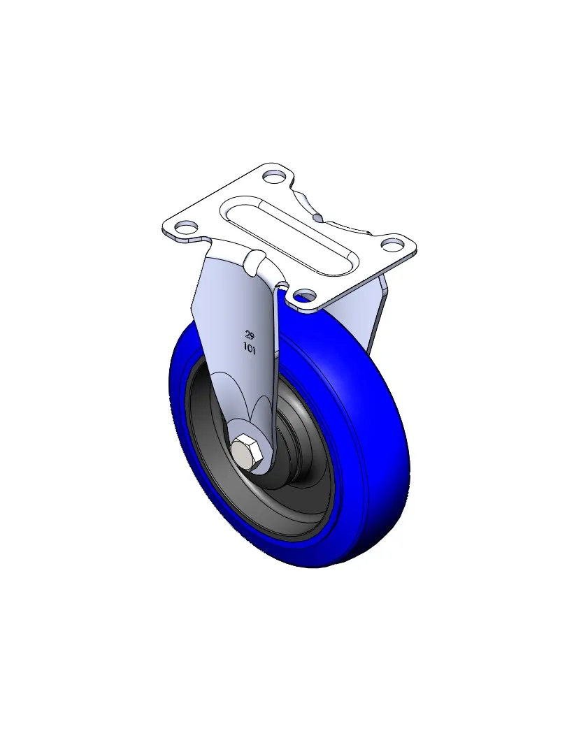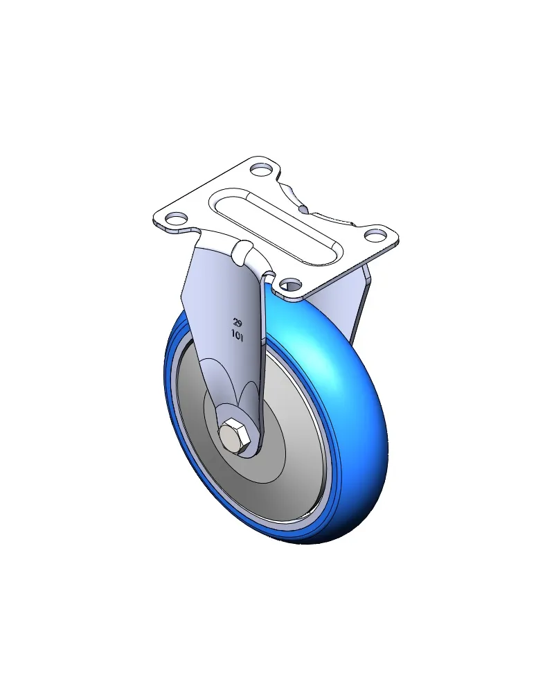 Rigid Caster with integrally molded Stamping footrest and 72 x 53.5 mm (2-7/8" x 2-1/8") Bolt Hole Spacing. Zine-Plated, Mounting Type - Top Plate, and plastic cover. Aluminum core with High Quality Polyurethane Wheel Tread. Blue color. Bearings: Ball Bearings.