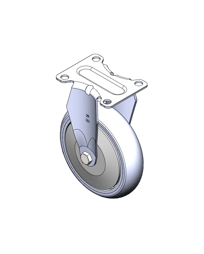 Rigid Caster with integrally molded, Stamping footrest and 72 x 53.5 mm (2-7/8" x 2-1/8") Bolt Hole Spacing. Zine-Plated, Mounting Type - Top Plate with plastic cover. Aluminum wheel center with High Quality Polyurethane Wheel Tread. Gray color, Bearing with Ball Bearings.