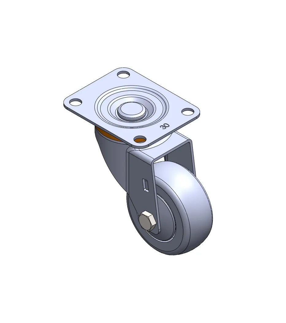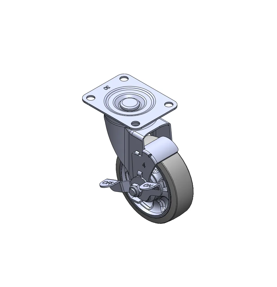 Casters with Total Brakes and With locking system. Premium Fork with Riveted Fork. Zine-Plated, Top Plate (3T) Mounting Type system. Reinforced, impact-resistant polypropylene Wheel Center with High-Quality Reinforced Polypropylene Rubber (TPR) Wheel Tread. Dark gray, Bearing with Ball Bearings.