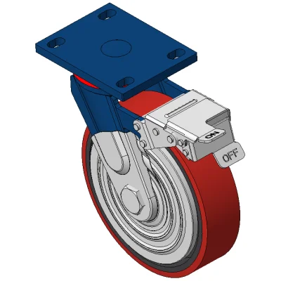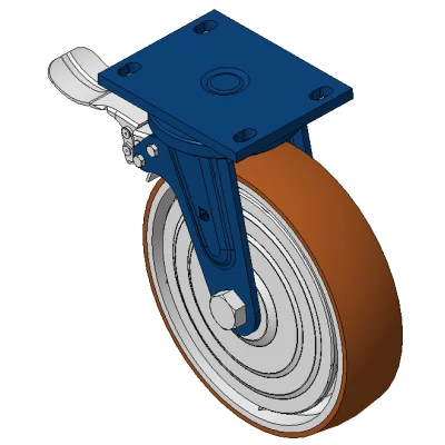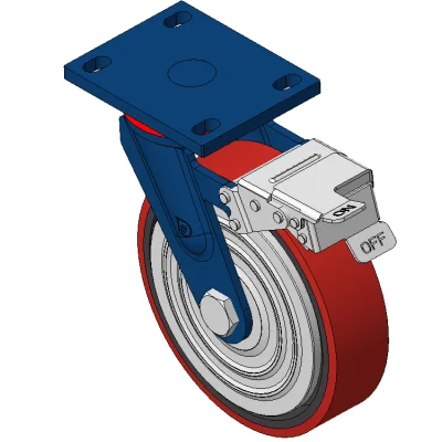 Casters with rear brake and With locking system, Welded Caster Fork Blue-painted finish, Mounting Type - Top Plate, 140x85 Bolt Hole Spacing Cast Iron Wheel Center, High Quality Polyurethane Wheel Tread, Cast Iron brown Bearings—Ball Bearings