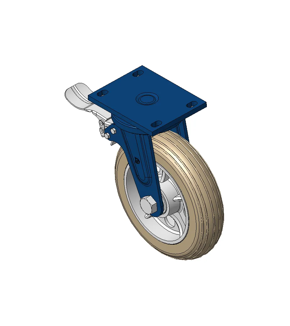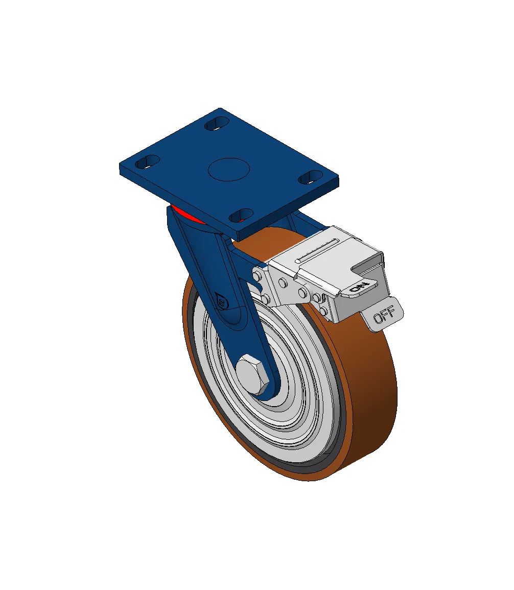 Casters with rear brake and With locking system, Welded Caster Fork Blue-painted finish, Mounting Type - Top Plate, 110x75 Bolt Hole Spacing Cast Iron Wheel Center, High Quality Polyurethane Wheel Tread, Cast Iron brown Bearings—Ball Bearings