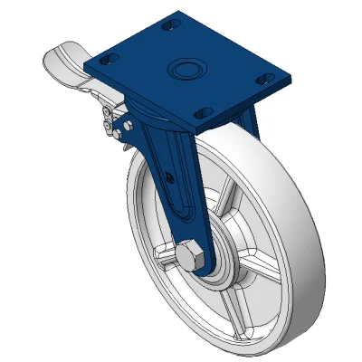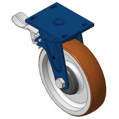 Castors with Front Brake locking system, Welded Caster Fork, blue painted surface Top Plate Mounting Type, Hole spacing 110x75 Cast Iron Wheel Center, High Quality Polyurethane Wheel Tread, Cast Iron brown Bearing - Ball Bearing