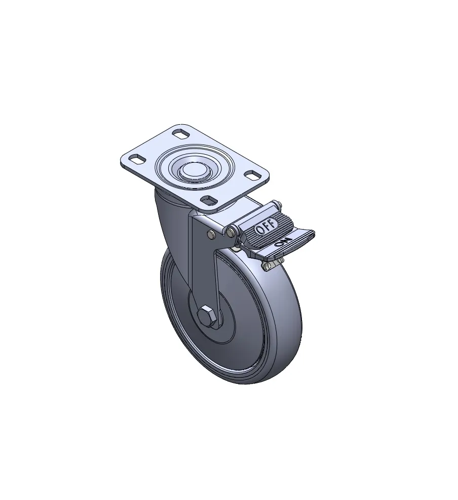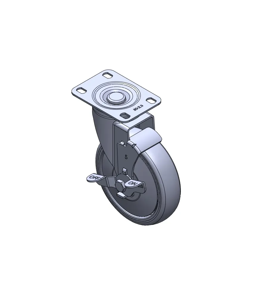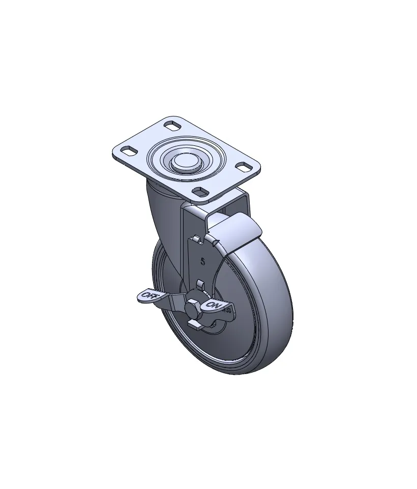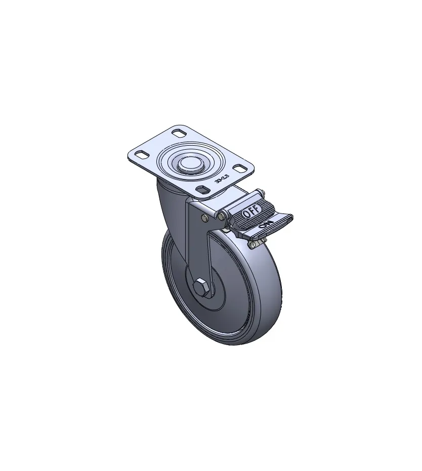 Casters with Side Brakes and With locking system. Top Plate Riveted and Stamping with step-through holes. Zine-Plated, Top Plate (3T) Mounting Type. High-Quality Impact-Resistant Polypropylene Wheel Center, High-Quality Reinforced Polypropylene Rubber (TPR) Wheel Tread. Dark gray, Bearing—Ball Bearings.