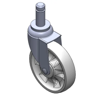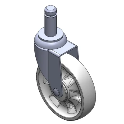 Swivel Casters, slit-type Riveted Stamping Fork—Ø21.5x56L with retaining rings Surface vibration, slit-type Mounting Type device (no logo) Reinforced thermoplastic Wheel Center and Wheel Tread White, Bearing—Ball Bearings