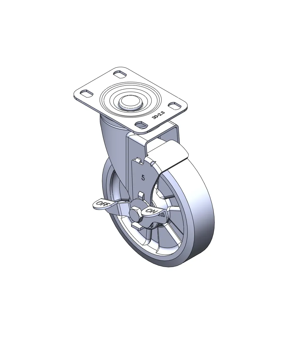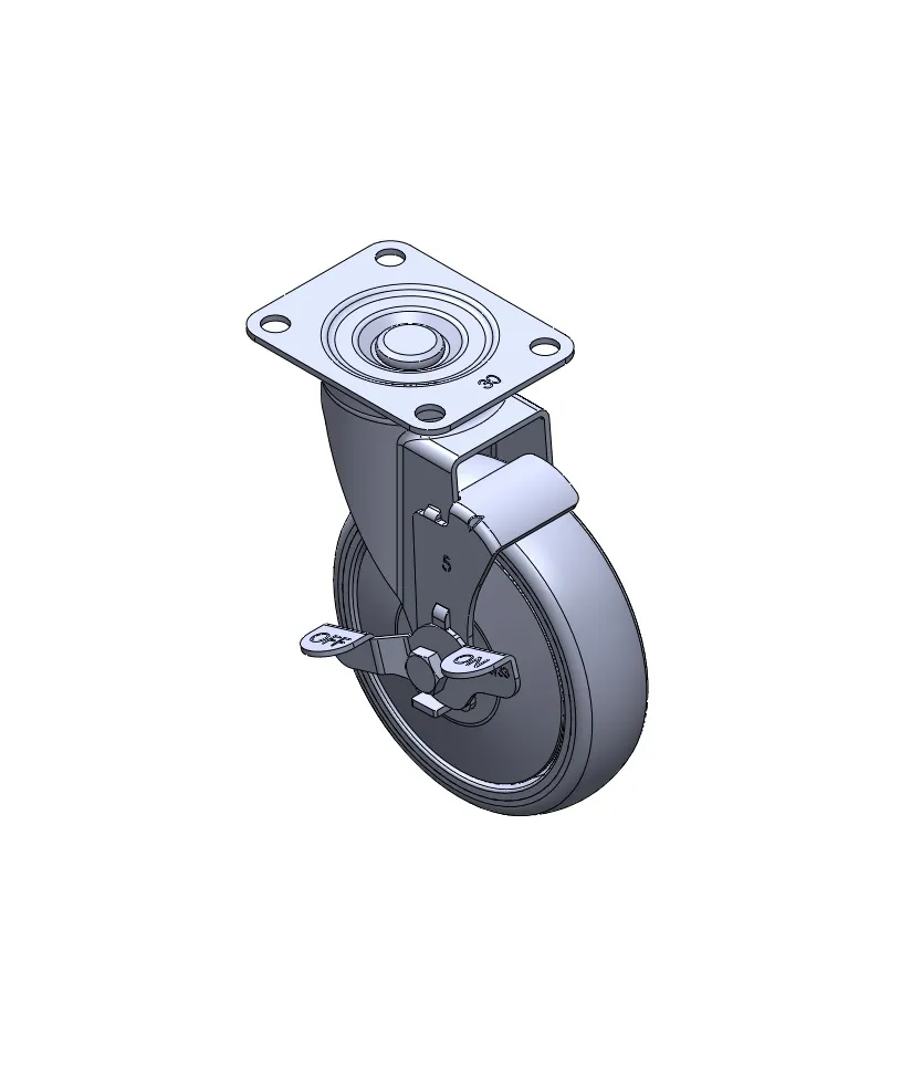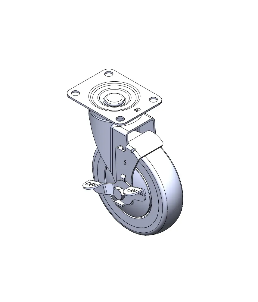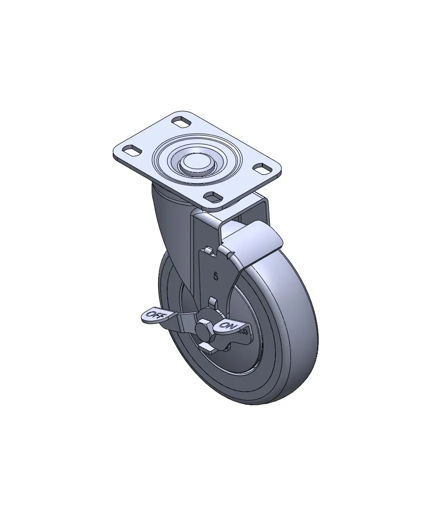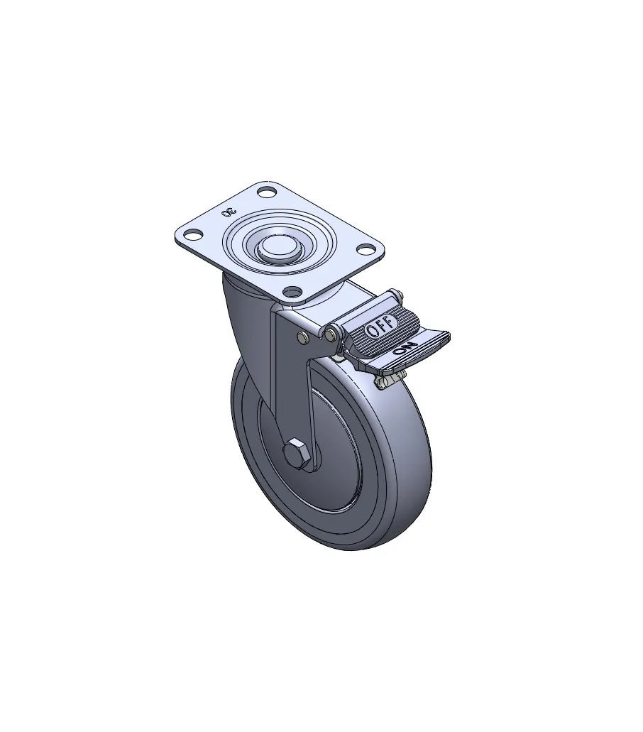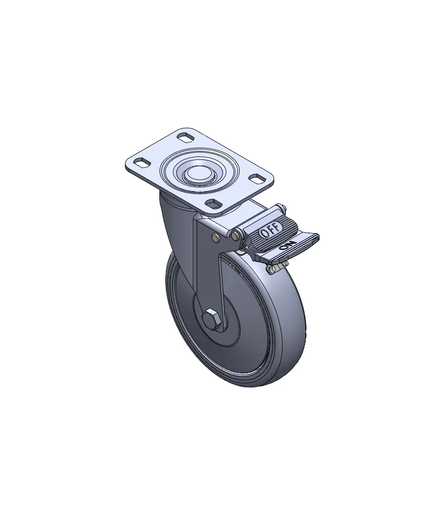 Casters with Side Brakes and With locking system. Top Plate Riveted and Stamping with step-up holes. Zine-Plated, Mounting Type - Top Plate. High-Quality Impact-Resistant Polypropylene Wheel Center with High-Quality Reinforced Polypropylene Rubber (TPR) Wheel Tread. Dark gray, Bearing—Ball Bearings.
