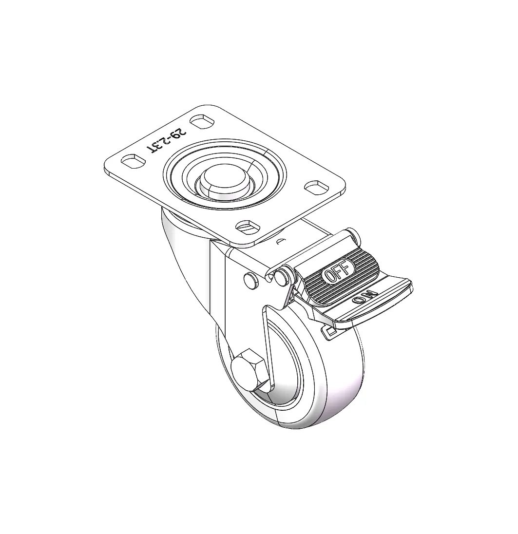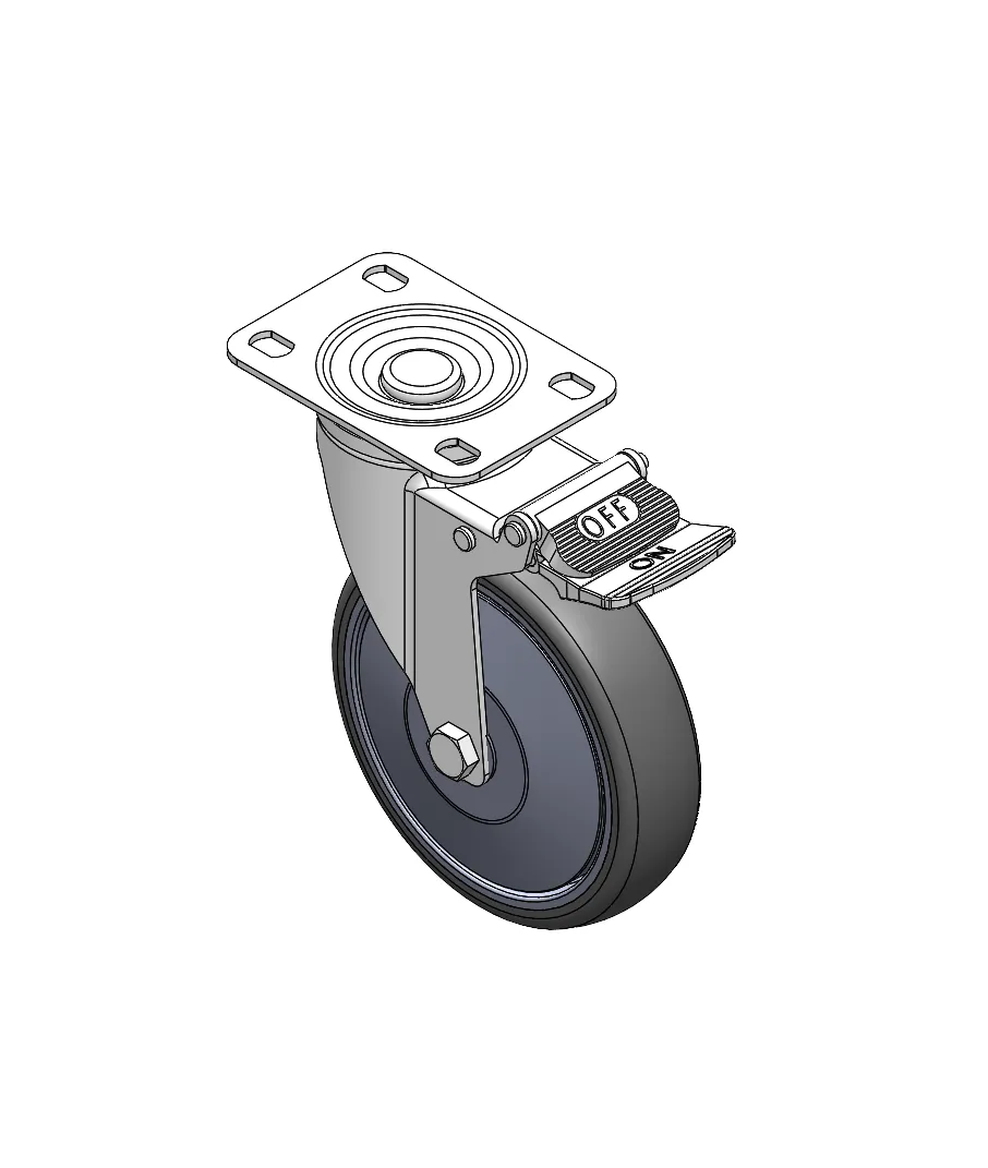 Castors with Total Brake locking system. Top Plate Riveted Fork - 75 x 45 mm (3" x 1-3/4") Bolt Hole Spacing Surface zinc-plated, Top Plate Mounting Type High-quality Impact Resistance Polypropylene Wheel Center,High-Quality Thermoplastic Rubber (TPR) Wheel Tread Dark grey, Bearing - Ball Bearings.