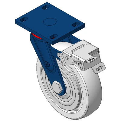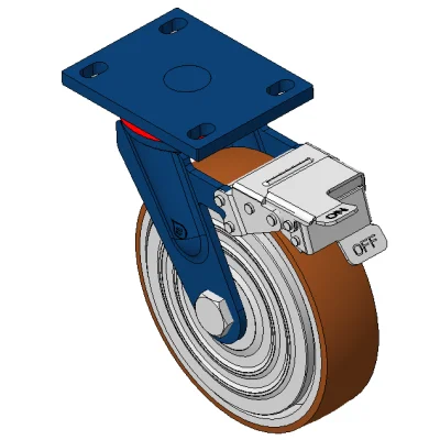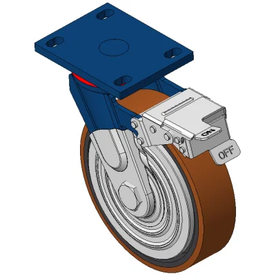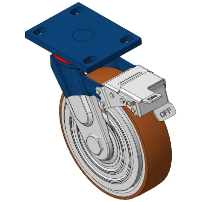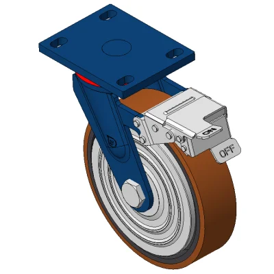 Casters with front brake and With locking system, Welded Caster Fork Blue-painted finish, Mounting Type - Top Plate, 110x75 Bolt Hole Spacing Cast Iron Wheel Center, High Quality Polyurethane Wheel Tread, Cast Iron brown Bearings—Ball Bearings with special Anti-thread wheel cover