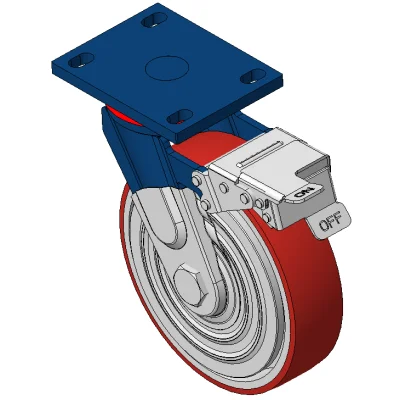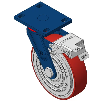 Casters with front brake and With locking system, Welded Caster Fork Blue-painted finish, Mounting Type - Top Plate, 110x75 Bolt Hole Spacing Cast Iron Wheel Center, High Quality Polyurethane Wheel Tread, Cast Iron red Bearings—Ball Bearings with special Anti-thread wheel cover