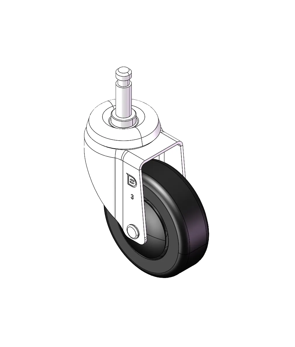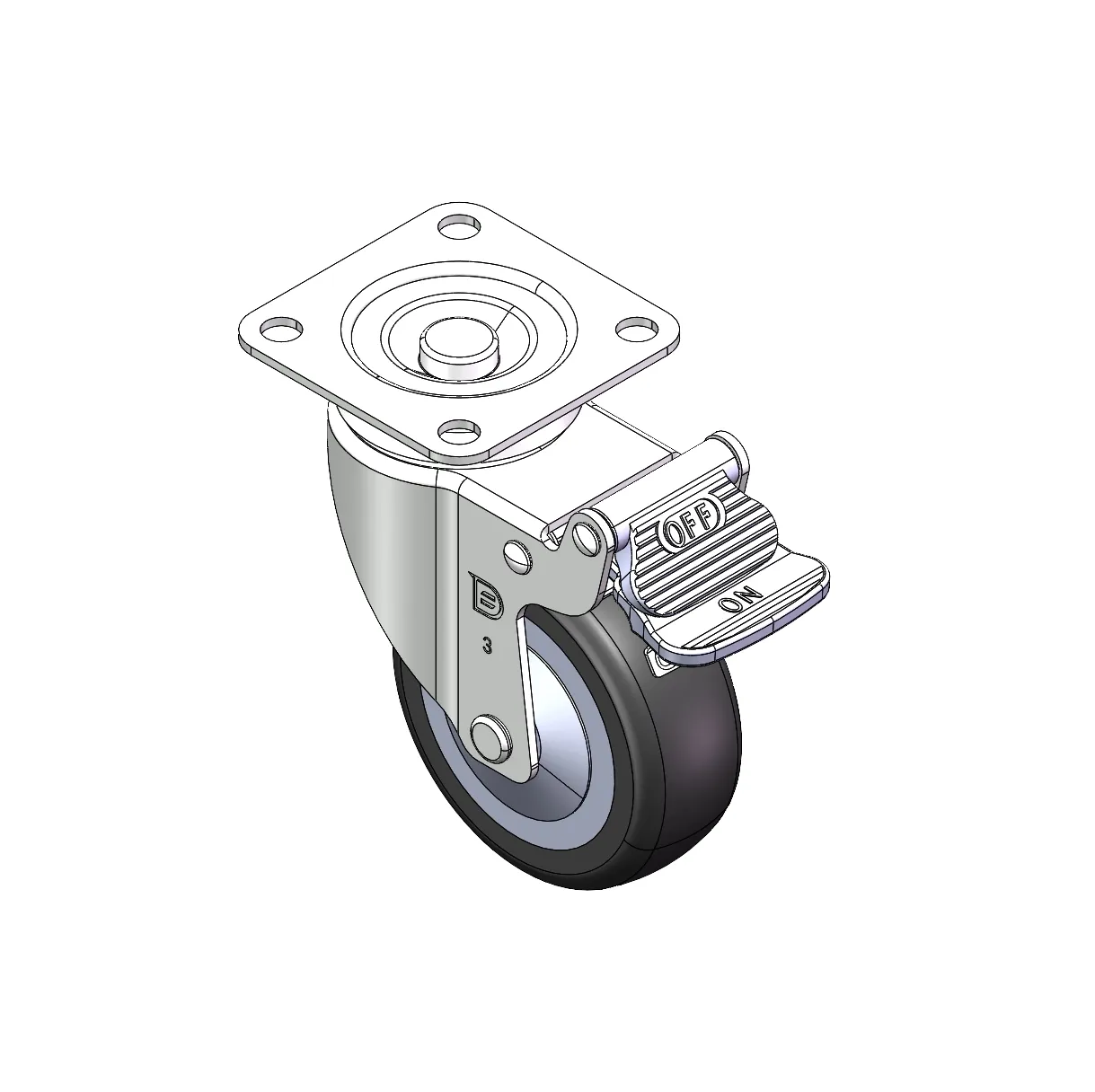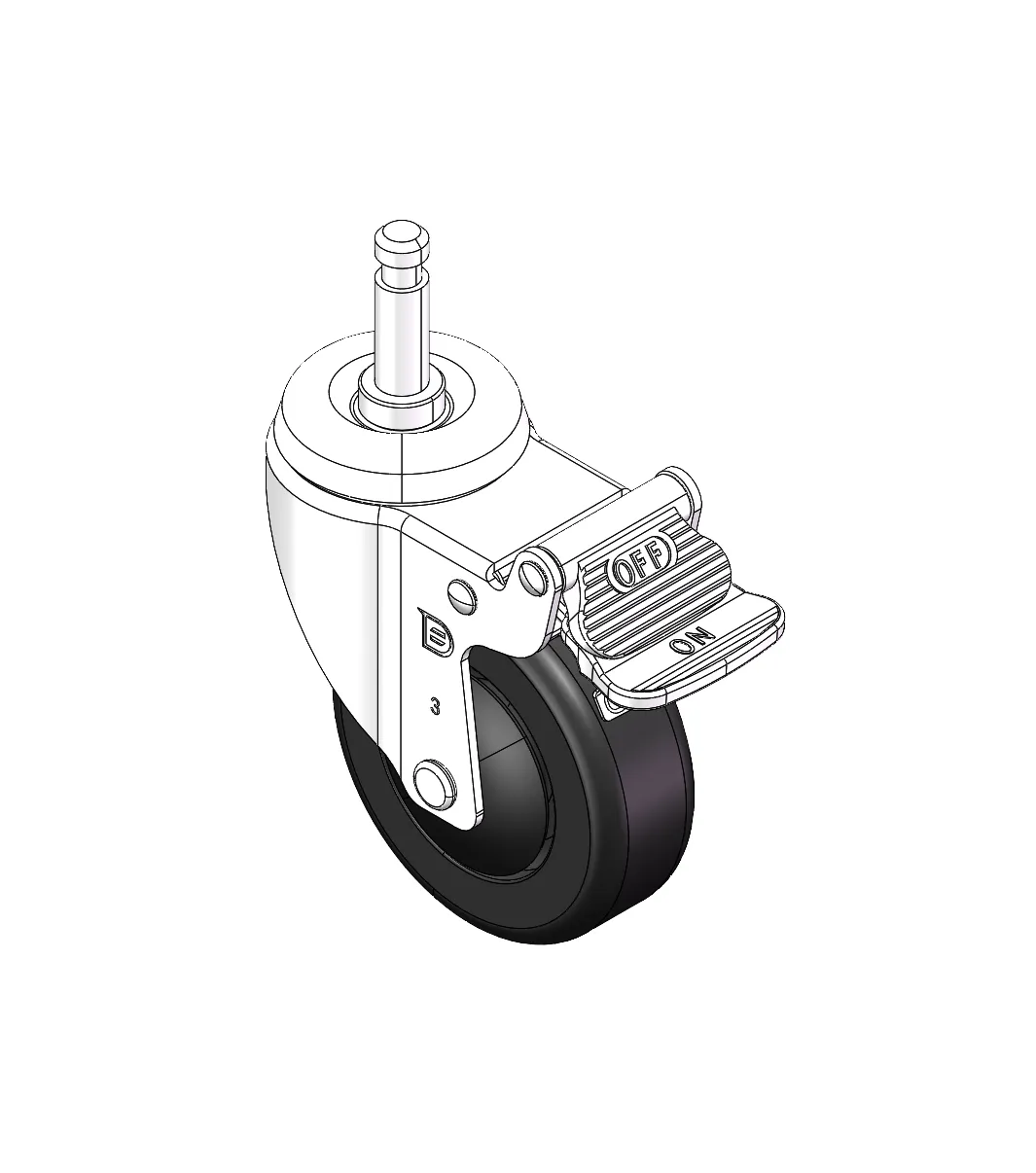 Castors with Total Brake Locking system. Stamped and Riveted Fork - Ø10x30.3L Extended control lever surface, stud Mounting Type High-quality Impact Resistance Polypropylene Wheel Center,High-Quality Thermoplastic Rubber (TPR) Wheel Tread Black, wheel - Plain Bearing.