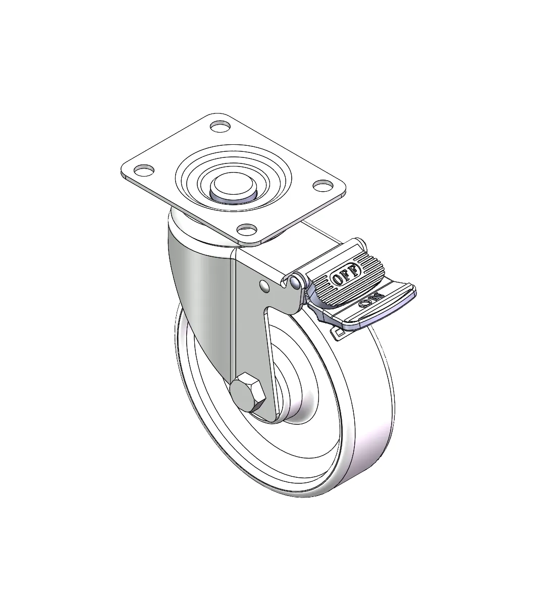 Castors with Total Brake Locking system. Riveted Stamping Top Plate - medical hole Extended control lever surface, Mounting Type - Top Plate Reinforced Polypropylene and Wheel Tread Transparent, wheel - Plain Bearing
