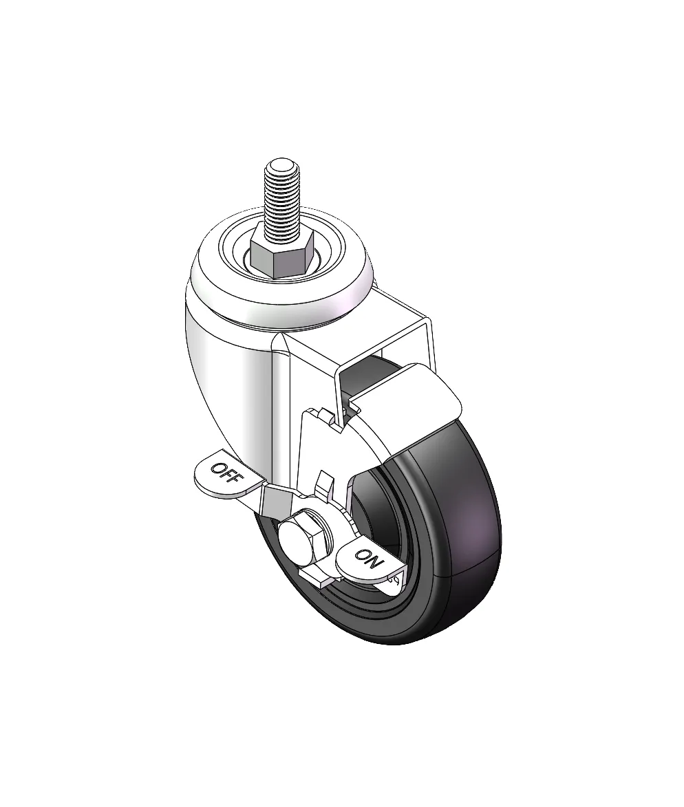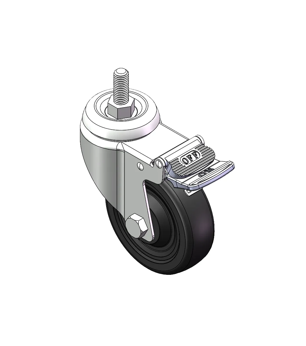 Casters with Total Brakes and Locking system. Threaded Stamping Fork - M12-P1.75 Extended control lever surface, Mounting Type - Threaded Stem Reinforced Polypropylene, High-Quality Resilient Rubber Wheel Tread Wheels - Plain Bearing