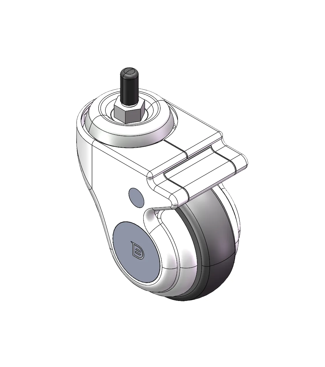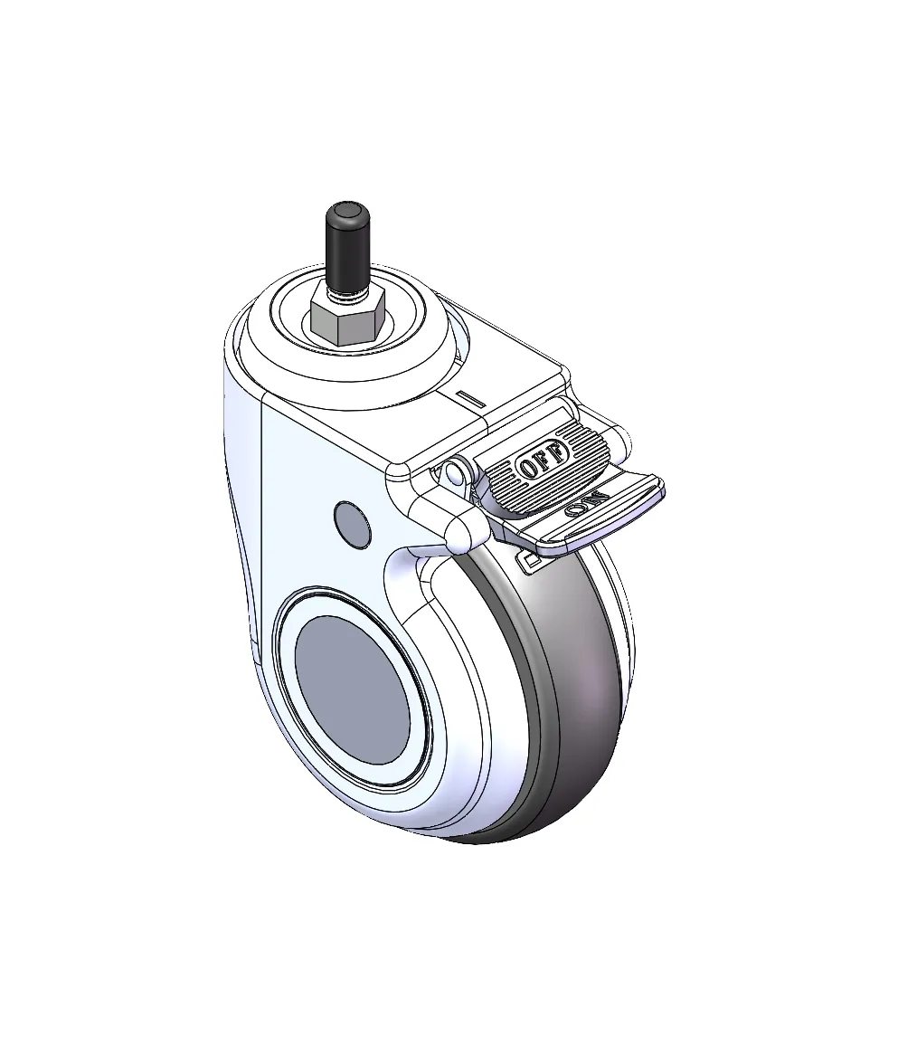 Castors with Total Brake Locking system. Threaded Fork - M12-P1.75 Extended control lever surface, Mounting Type - Threaded Stem High-quality Impact Resistance Polypropylene Wheel Center,High-Quality Thermoplastic Rubber (TPR) Wheel Tread Pearl grey, Bearing - Ball Bearing.