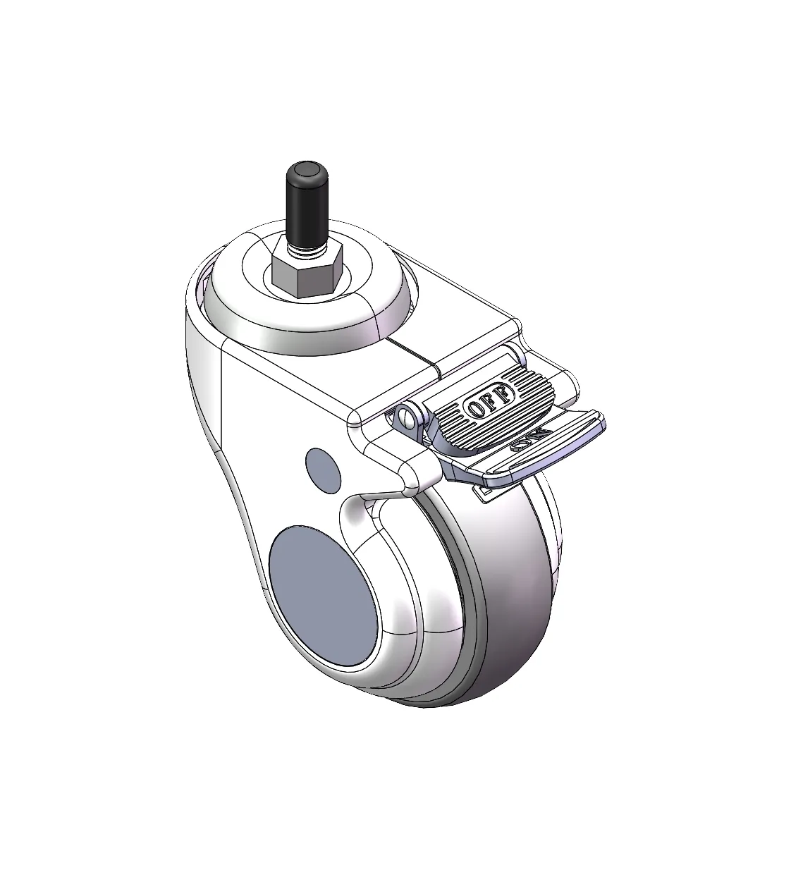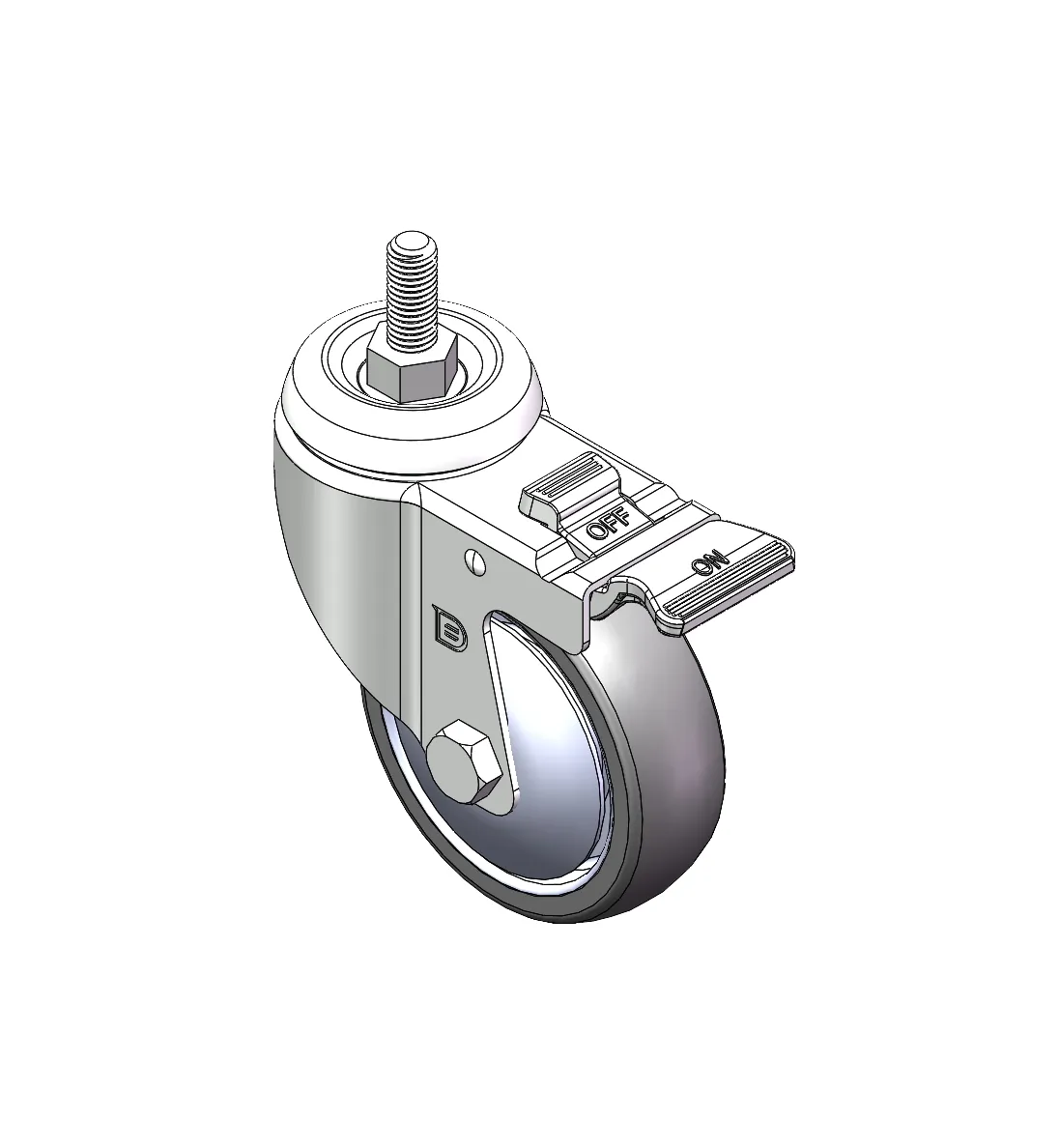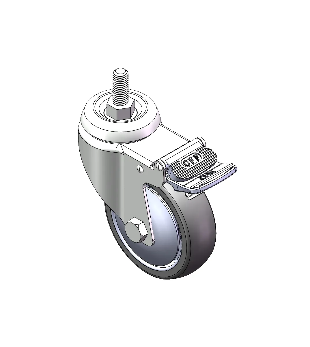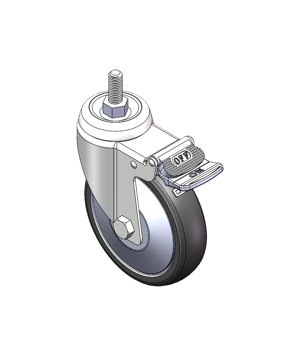 Casters with Total Brake Locking system. Thread-Riveted Stamping Fork—M12-P1.75 Extended control lever surface, Mounting Type - Threaded Stem device + Threaded Stem protective sleeve High-quality Impact Resistance Polypropylene Wheel Center,High-Quality Thermoplastic Rubber (TPR) Wheel Tread Pearl-colored dark gray, Bearing—Ball Bearing.