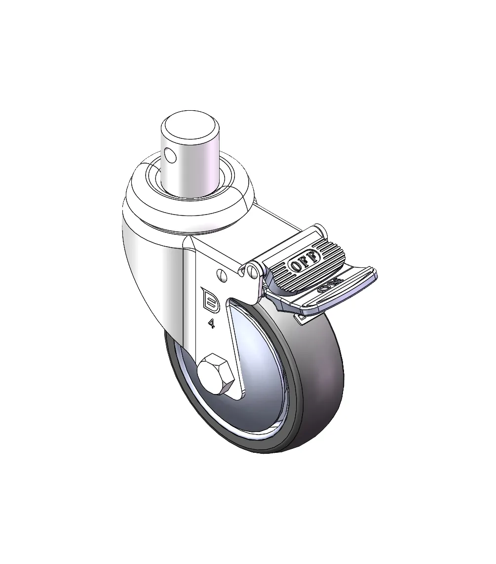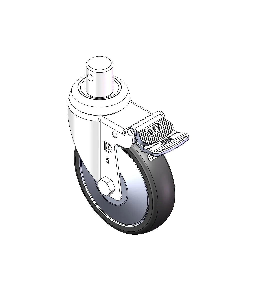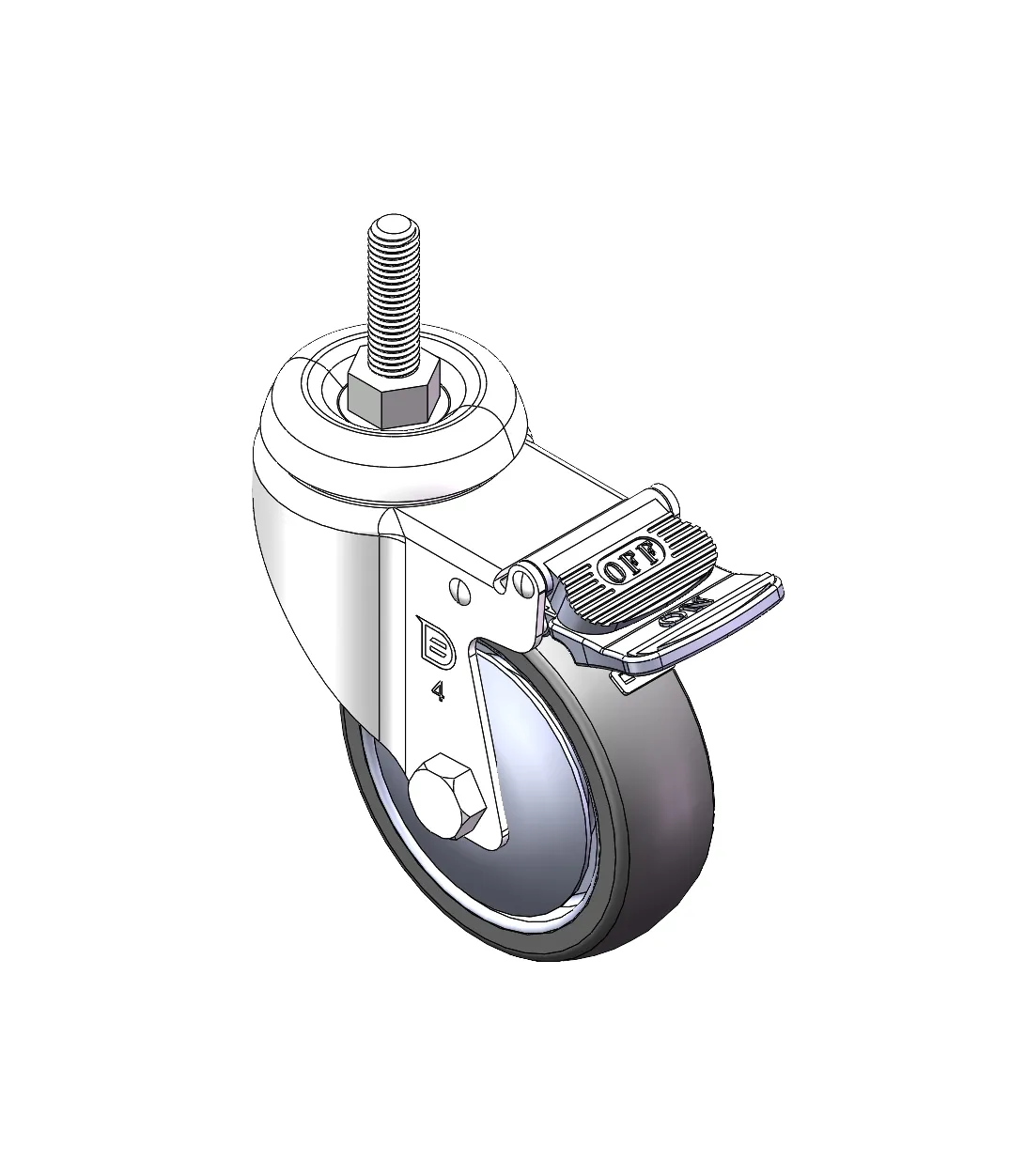 Castors with Total Brake Locking system. Stamped and Riveted feet - Ø28x30L Surface zinc-plated, stud Mounting Type, M8 hole High-quality Impact Resistance Polypropylene Wheel Center,High-Quality Thermoplastic Rubber (TPR) Wheel Tread Pearl-finish dark grey, Bearing - Ball Bearing.