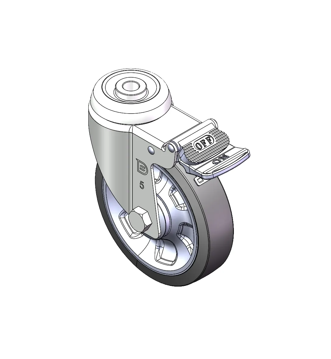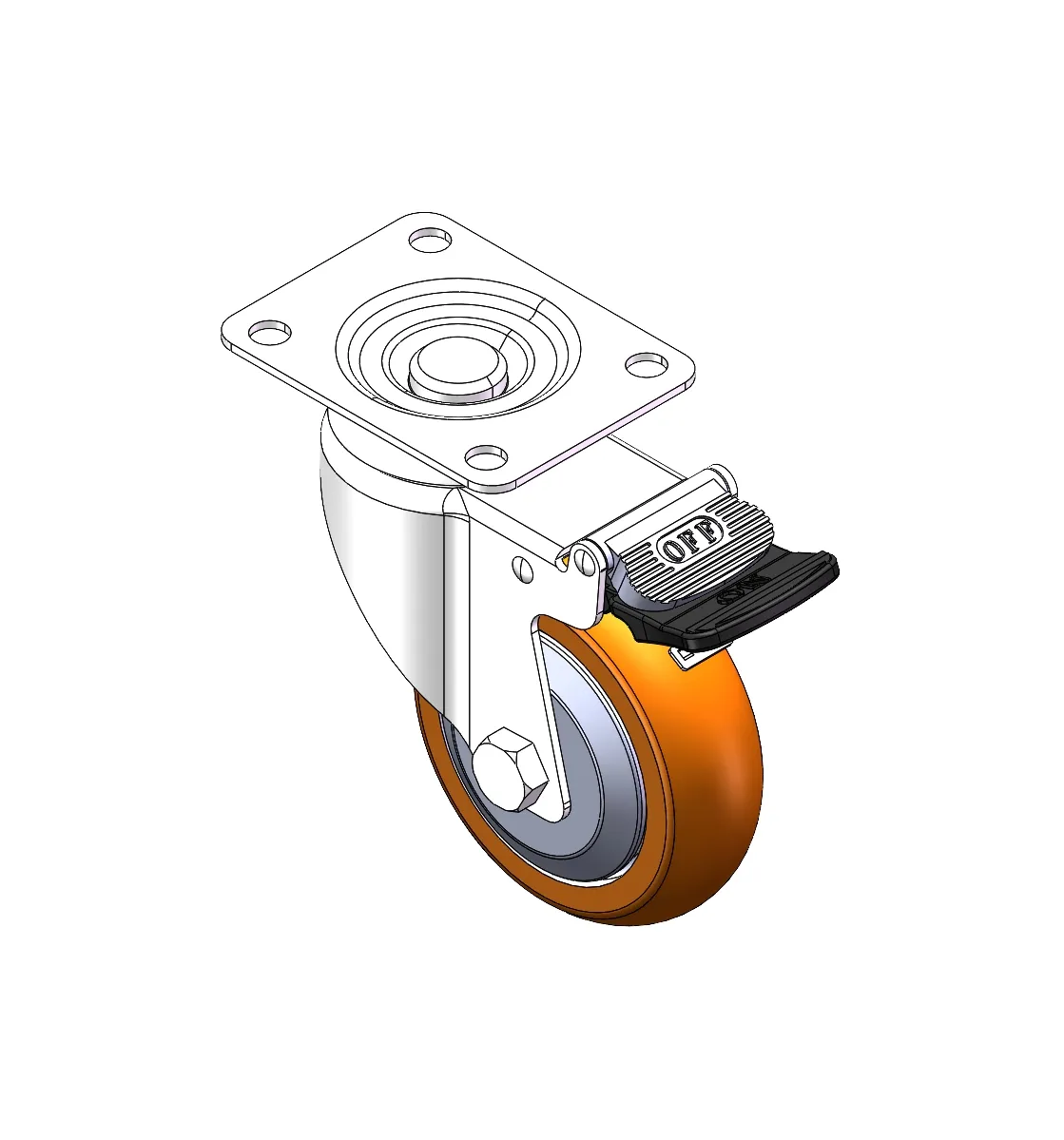 Casters with Total Brakes and a With locking system. Single Bolthole Stamping Fork with 12.5 holes.