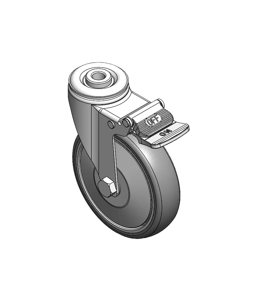 Castors with Total Brake Locking system. Single Bolthole Fork – ∅12.5 Surface Zine-Plated, Mounting Type - Single Bolthole High-quality Impact Resistance Polypropylene Wheel Center,High-Quality Thermoplastic Rubber (TPR) Wheel Tread Dark grey, Bearing – Ball Bearing.
