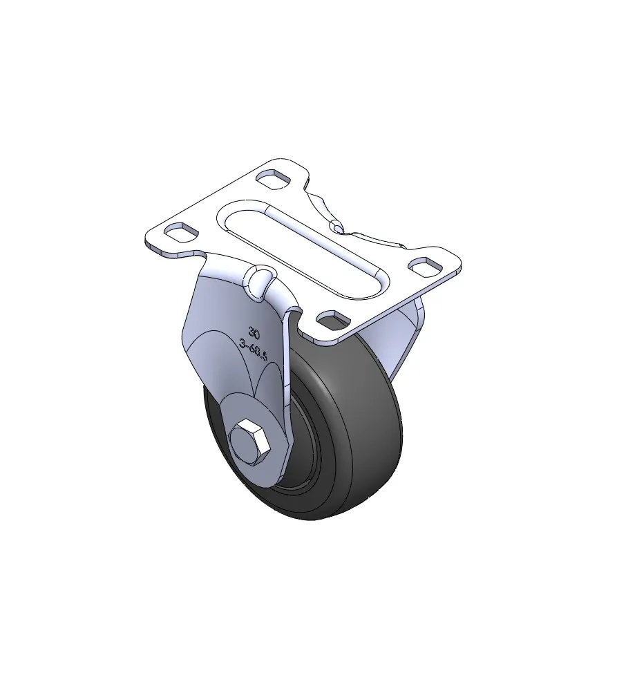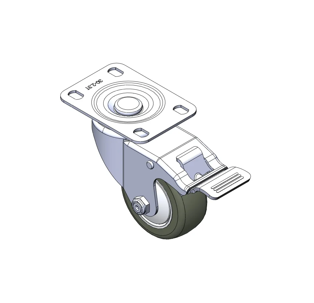 Casters with Total Brakes and a With locking system. Premium Fork with Riveted Fork. Zine-Plated, Mounting Type - Top Plate. High-Quality Impact-Resistant Polypropylene Wheel Center with High-Quality Reinforced Polypropylene Rubber (TPR) Wheel Tread. Dark gray, Bearing with Ball Bearings.