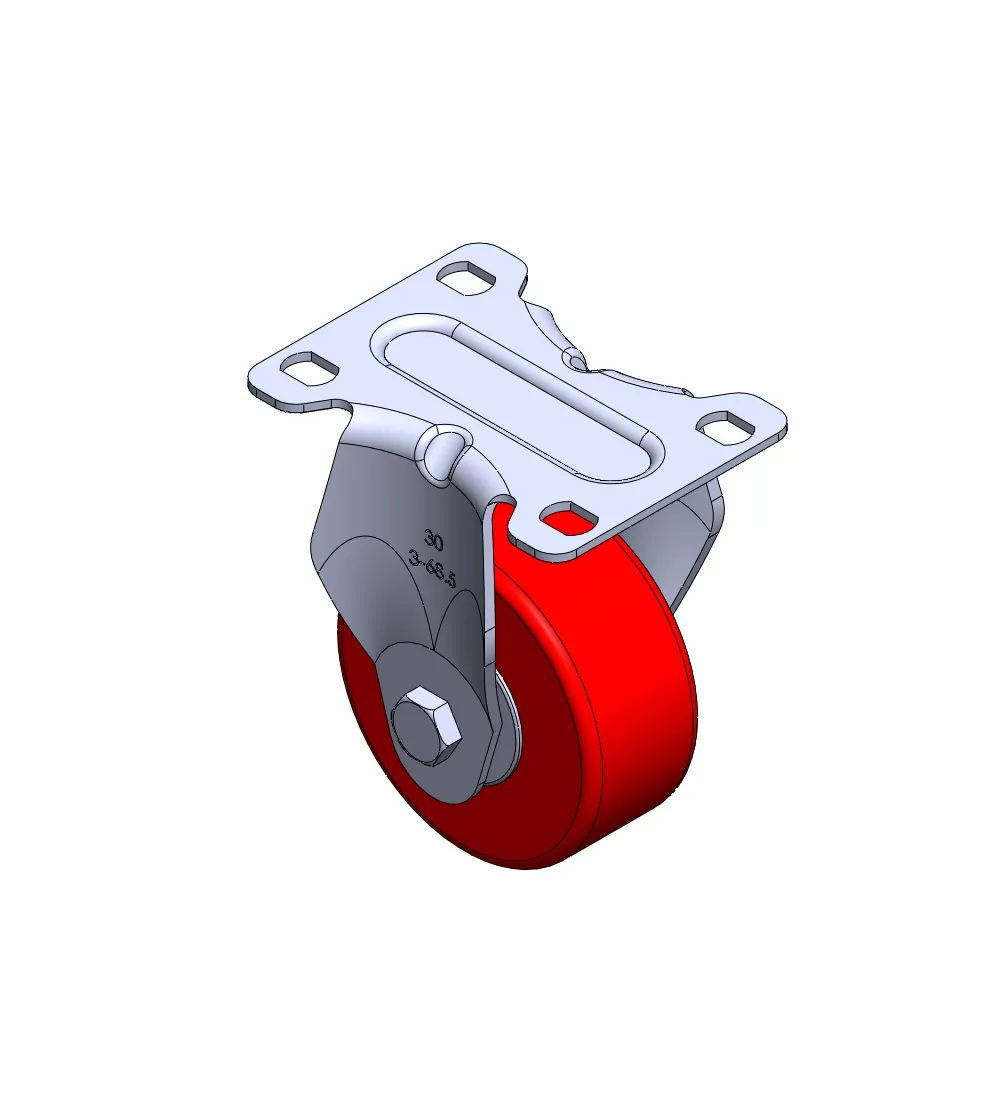 Rigid Caster with Stamping Fabricated Caster Fork and 75 x 45 mm (3" x 1-3/4") Bolt Hole Spacing. Zine-Plated, Mounting Type - Top Plate. Cast Iron core with High Quality Polyurethane Wheel Tread. Red Cast Iron finish. Bearings: Ball Bearings.