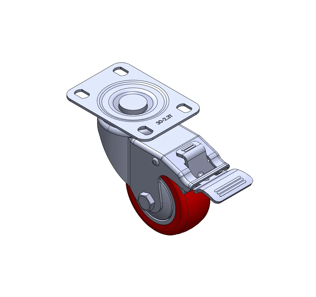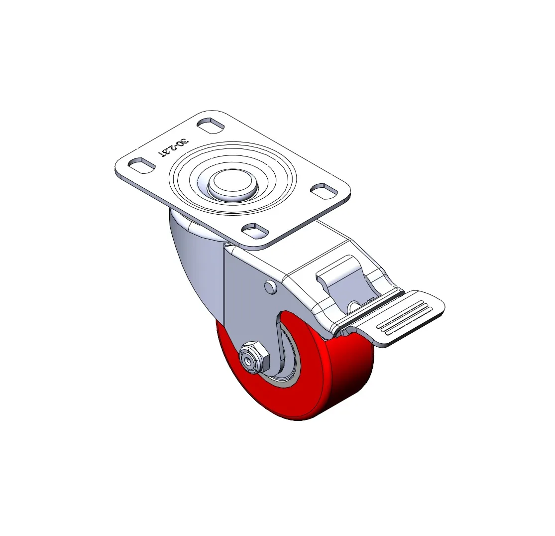 Casters with Total Brakes and a With locking system. High-Quality Top Plate with Riveted Fork. Hole Zine-Plated, Mounting Type - Top Plate. Cast Iron core with High Quality Polyurethane Wheel Tread. Red Cast Iron finish, Bearing with Ball Bearings.