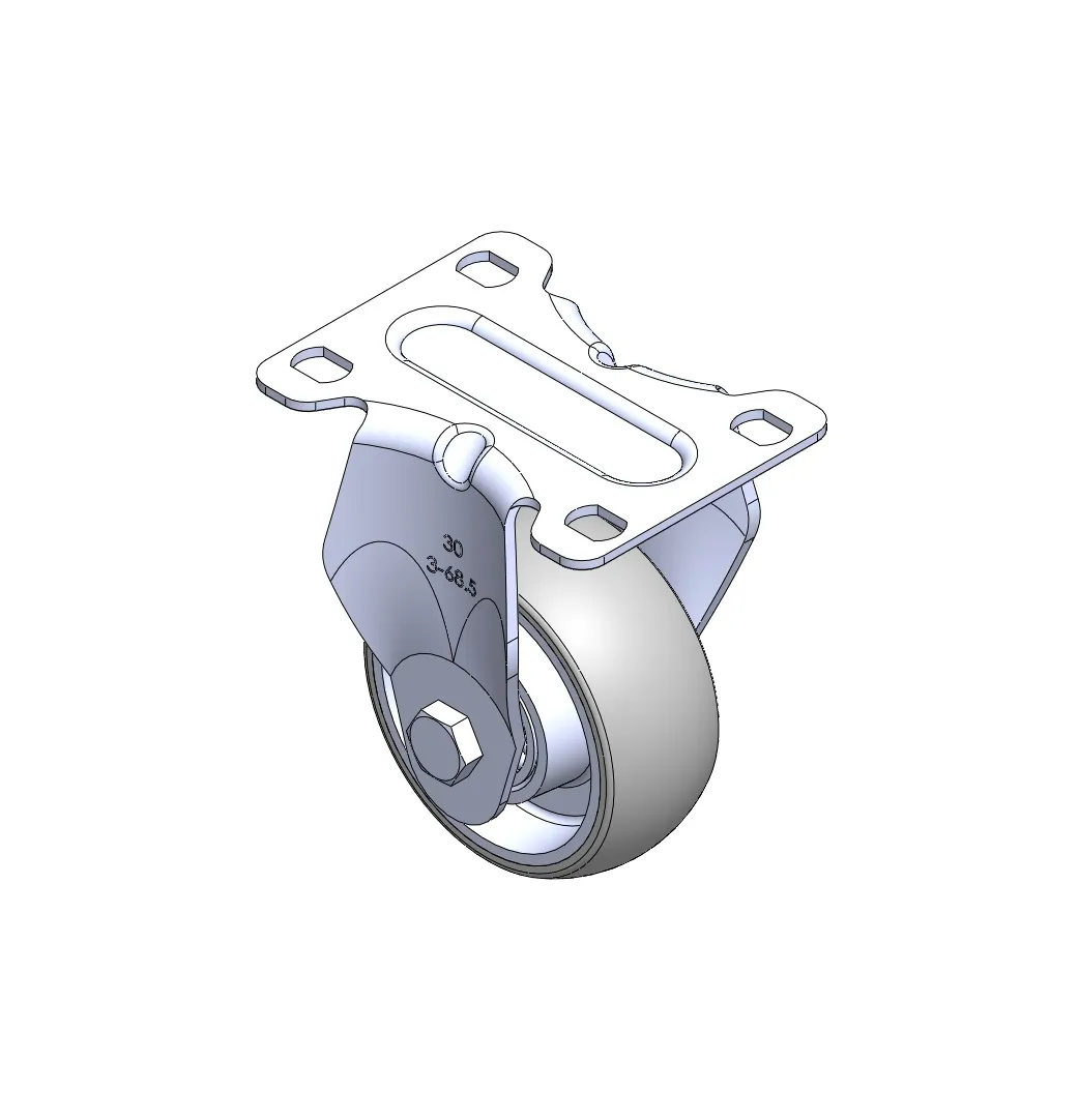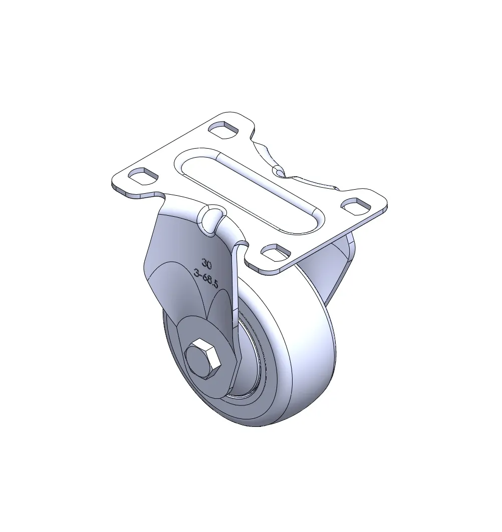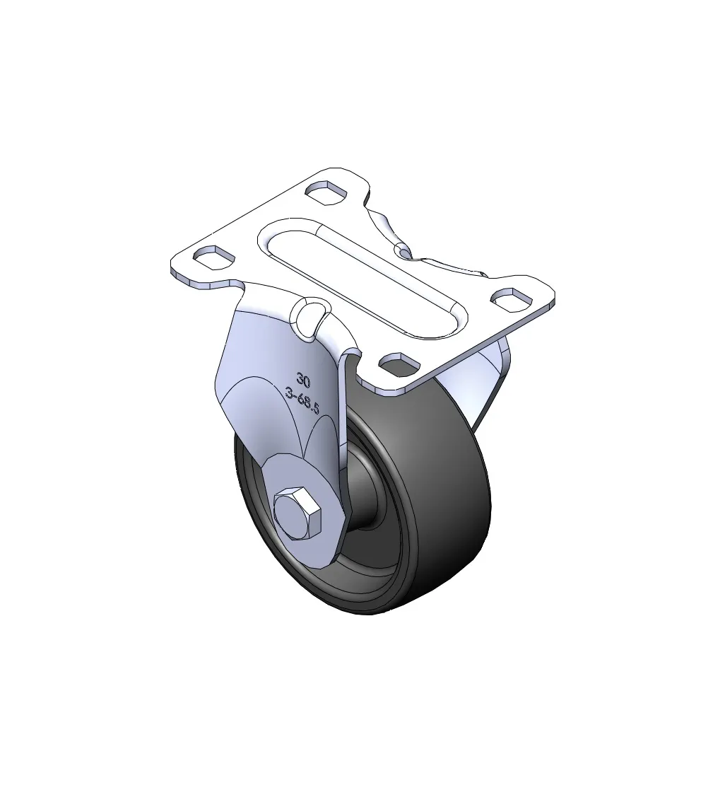 Rigid Caster with Stamping Fabricated Caster Fork and 75 x 45 mm (3" x 1-3/4") Bolt Hole Spacing. Zine-Plated, Mounting Type - Top Plate. Reinforced Polypropylene plastic core and Wheel Tread. Bearing - Plain Bearing.