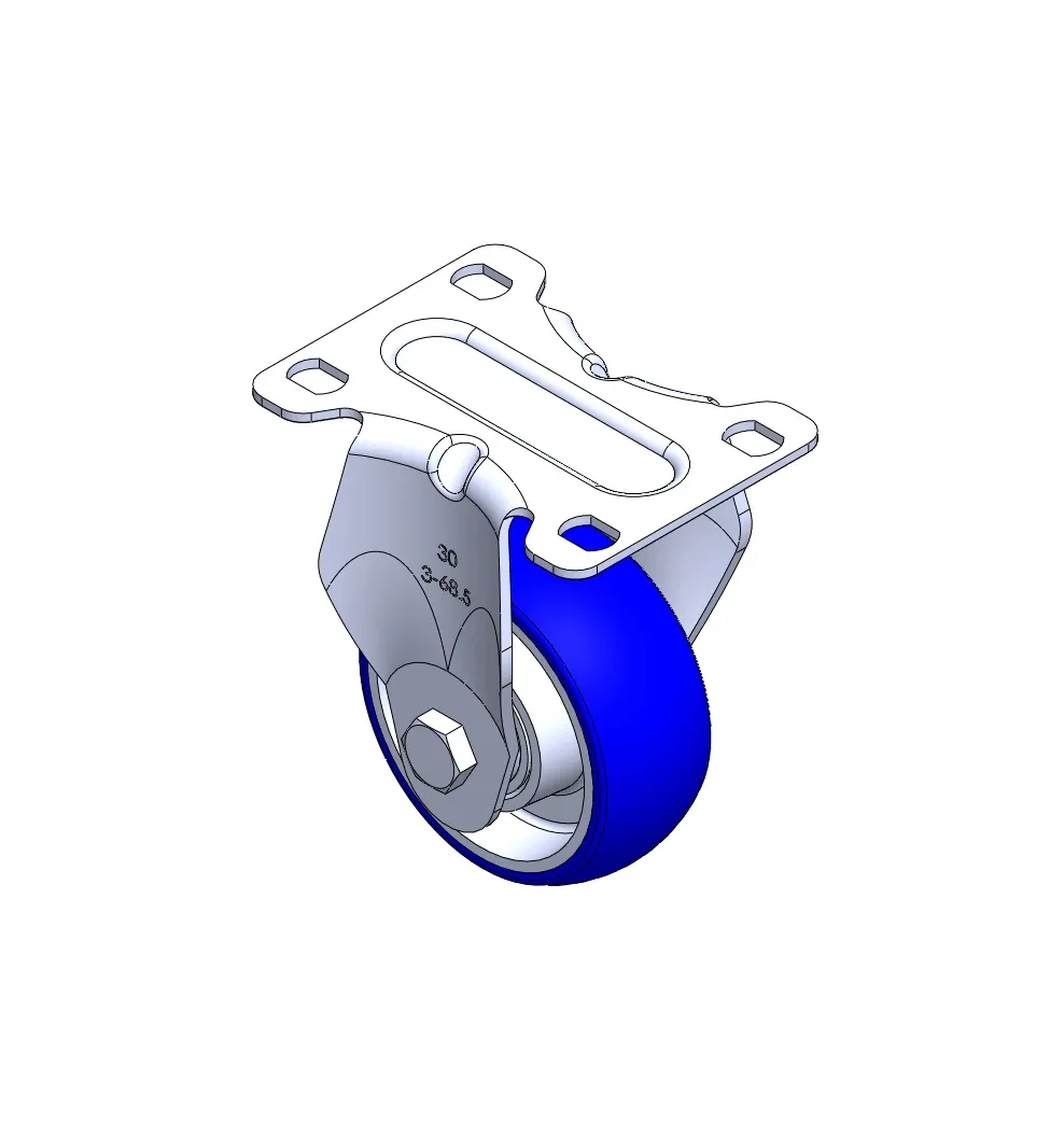 Rigid Caster with Stamping Fabricated Caster Fork and 75 x 45 mm (3" x 1-3/4") Bolt Hole Spacing. Zine-Plated, Mounting Type - Top Plate. Aluminum core with High Quality Polyurethane Wheel Tread. Blue color. Bearings: Ball Bearings.