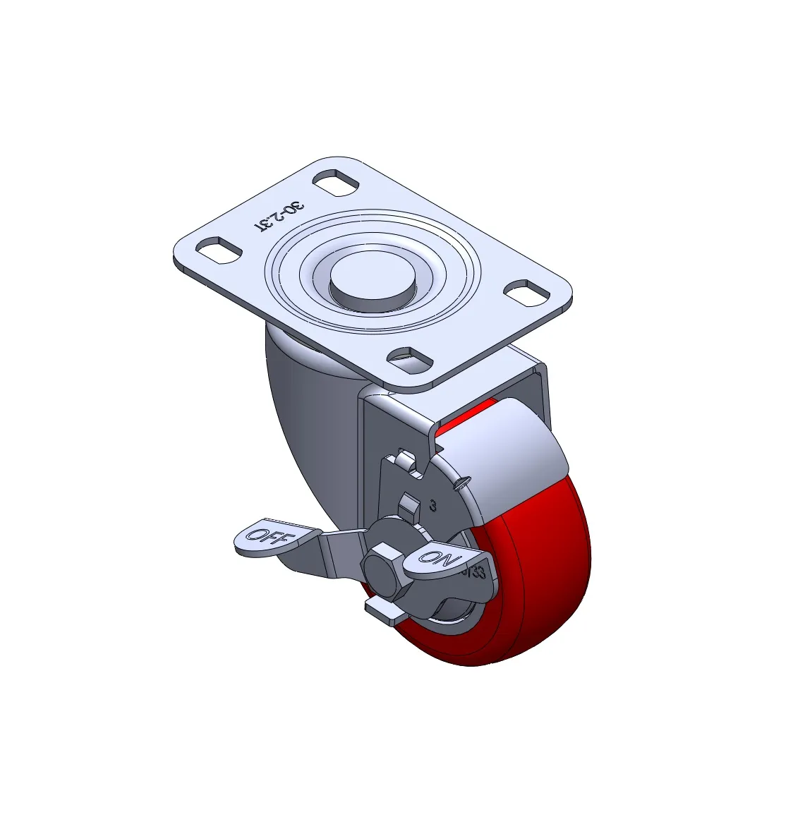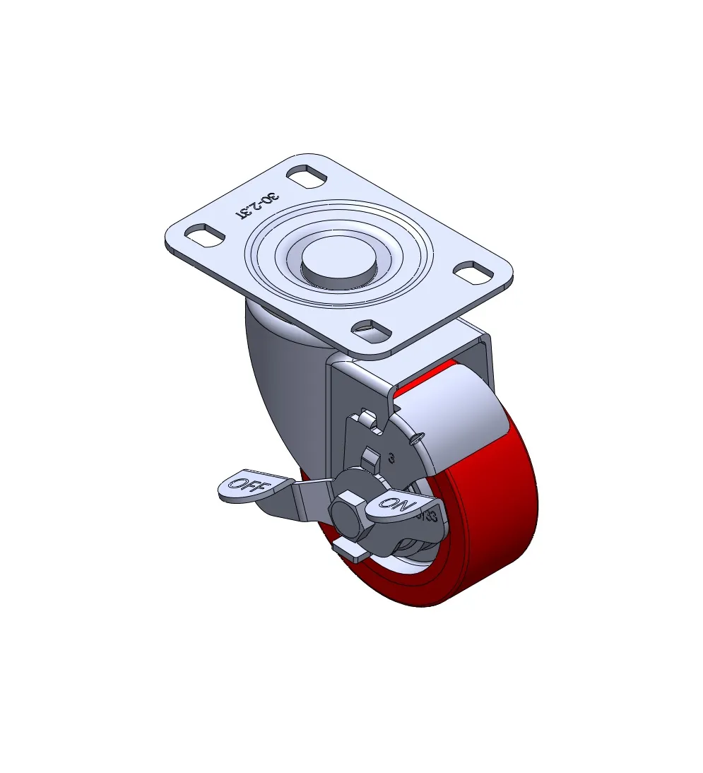Casters with Side Brakes and With locking system. Top Plate Riveted and Stamping with step holes. Zine-Plated, Mounting Type - Top Plate. Cast Iron core with High Quality Polyurethane Wheel Tread. Red Cast Iron finish. Bearings: Ball Bearings.