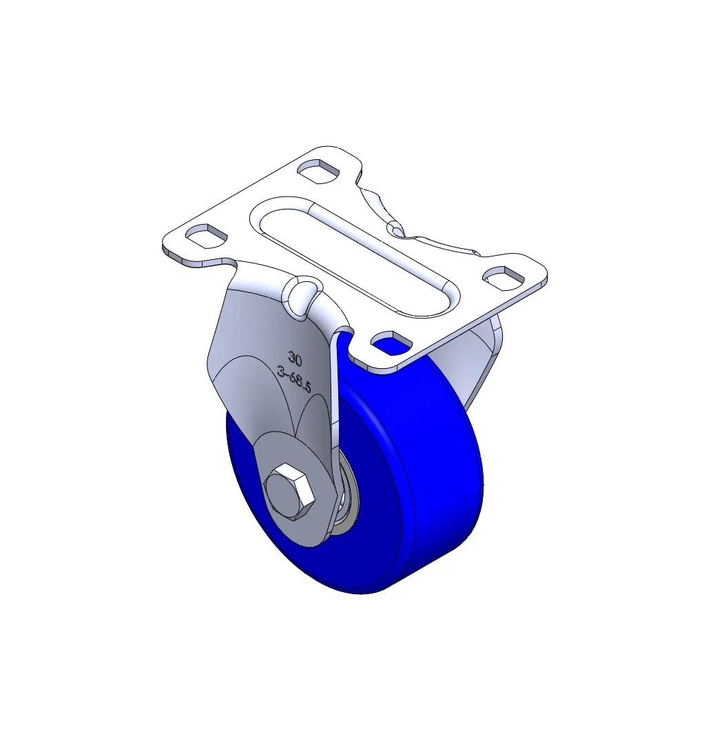 Rigid Caster with Stamping Fabricated Caster Fork and 75 x 45 mm (3" x 1-3/4") Bolt Hole Spacing. Zine-Plated, Mounting Type - Top Plate. Cast Iron core with High Quality Polyurethane Wheel Tread. Blue color. Bearings: Ball Bearings.