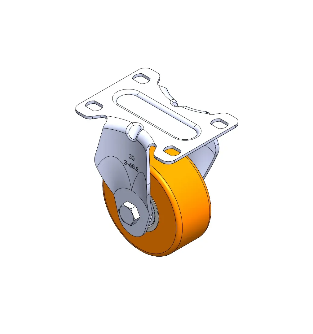 Rigid Caster with Stamping Fabricated Caster Fork and 75 x 45 mm (3" x 1-3/4") Bolt Hole Spacing. Zine-Plated, Mounting Type - Top Plate. Cast Iron core, High Quality Polyurethane Wheel Tread. Brown color, Ball Bearings.